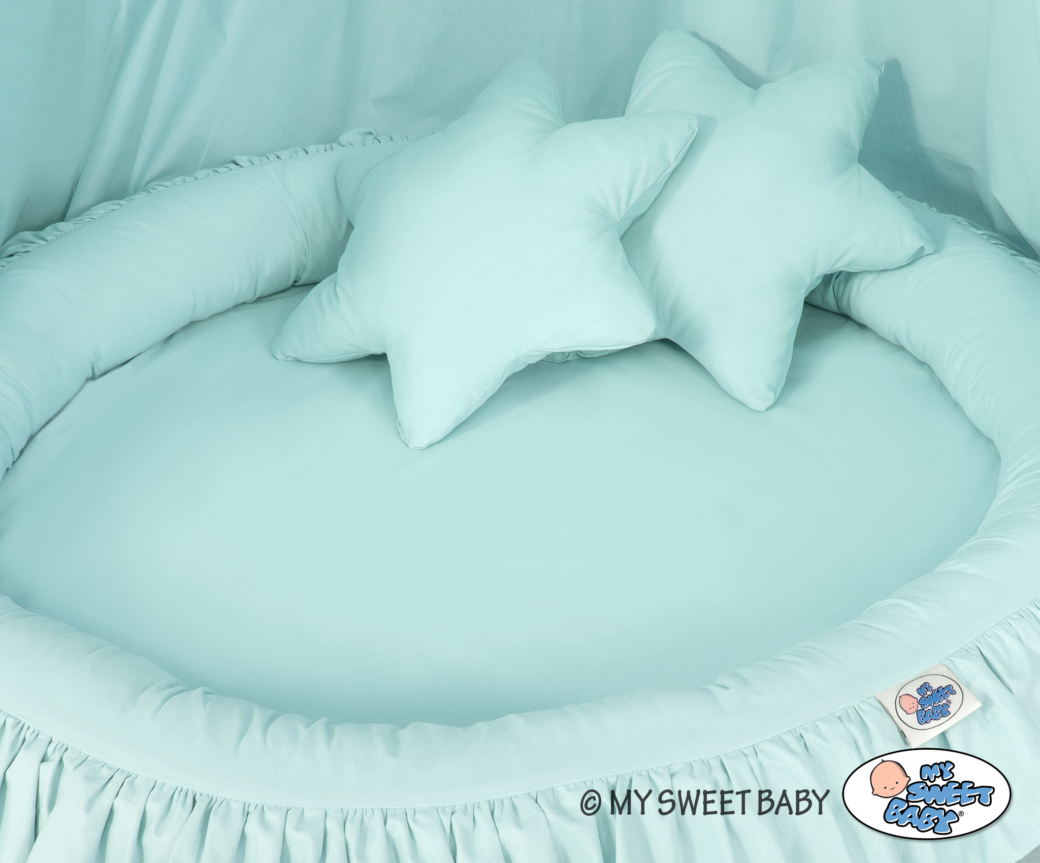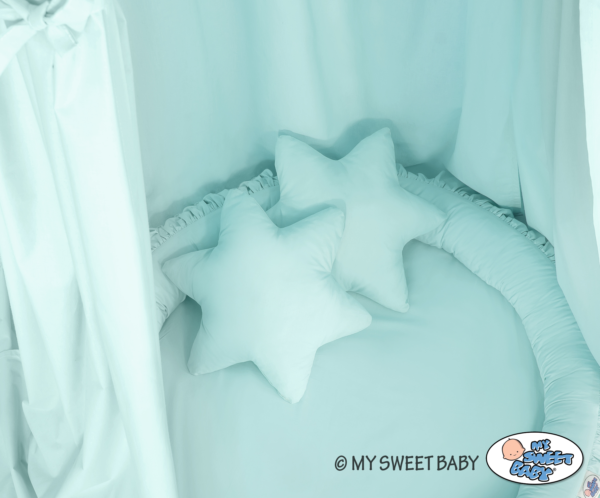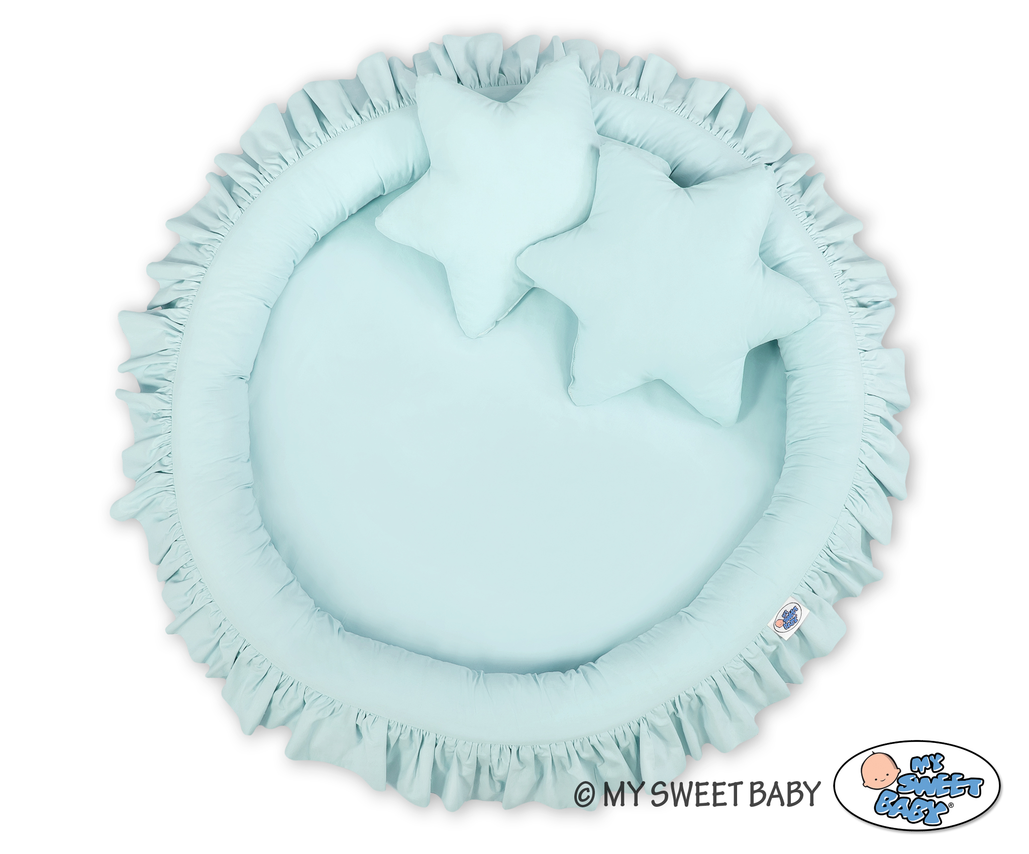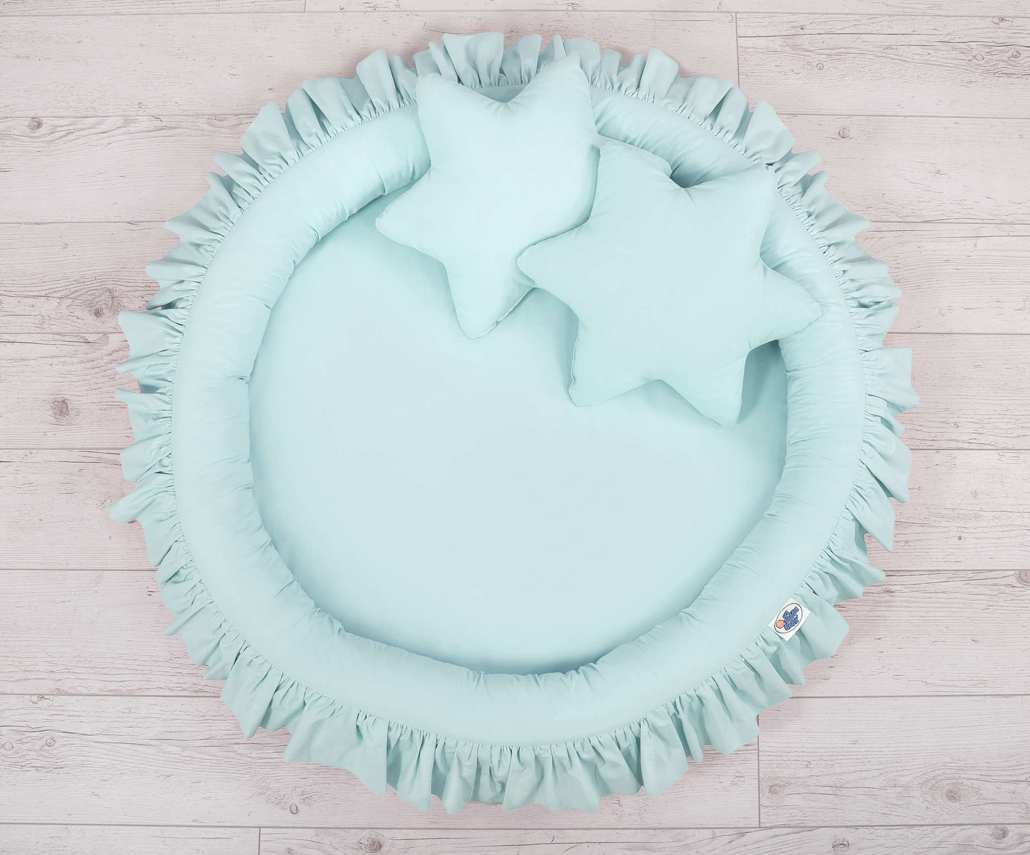 An effective long hanging canopy. A beautiful element it the children's room. It can be used as a unique decoration of a baby cot, as well as it can create a wonderful place to play. Hanging over the cot protect the canopy against too much light and noise creating a cozy and safe place to rest inside the cot. The canopy can be easily mounted to the ceiling. The length of 260 cm allows to arrange the ends on the floor. This creates a perfect hiding place and playground for older children. The canopy is made of Okotex certificated, 100% cotton fabric. On the sides there are practical ribbons for tying the canopy and create a beautiful tent. The rim on the top can be removed. The fabric is washable by 30 Degrees. Combined with lovely nest with a flounce it will become a perfect place for fun. The soft edges provide safety for the babies. The edge is filled with approved, non-allergenic filling: Eco -Fillball fibers. They are soft, resilience and they assure the proper air circulation. The bottom of the baby nest with flounce is made of a modern, anti-allergenic, attested material. The bottom inlay can be removed and the cover can be washed at 30 degrees.