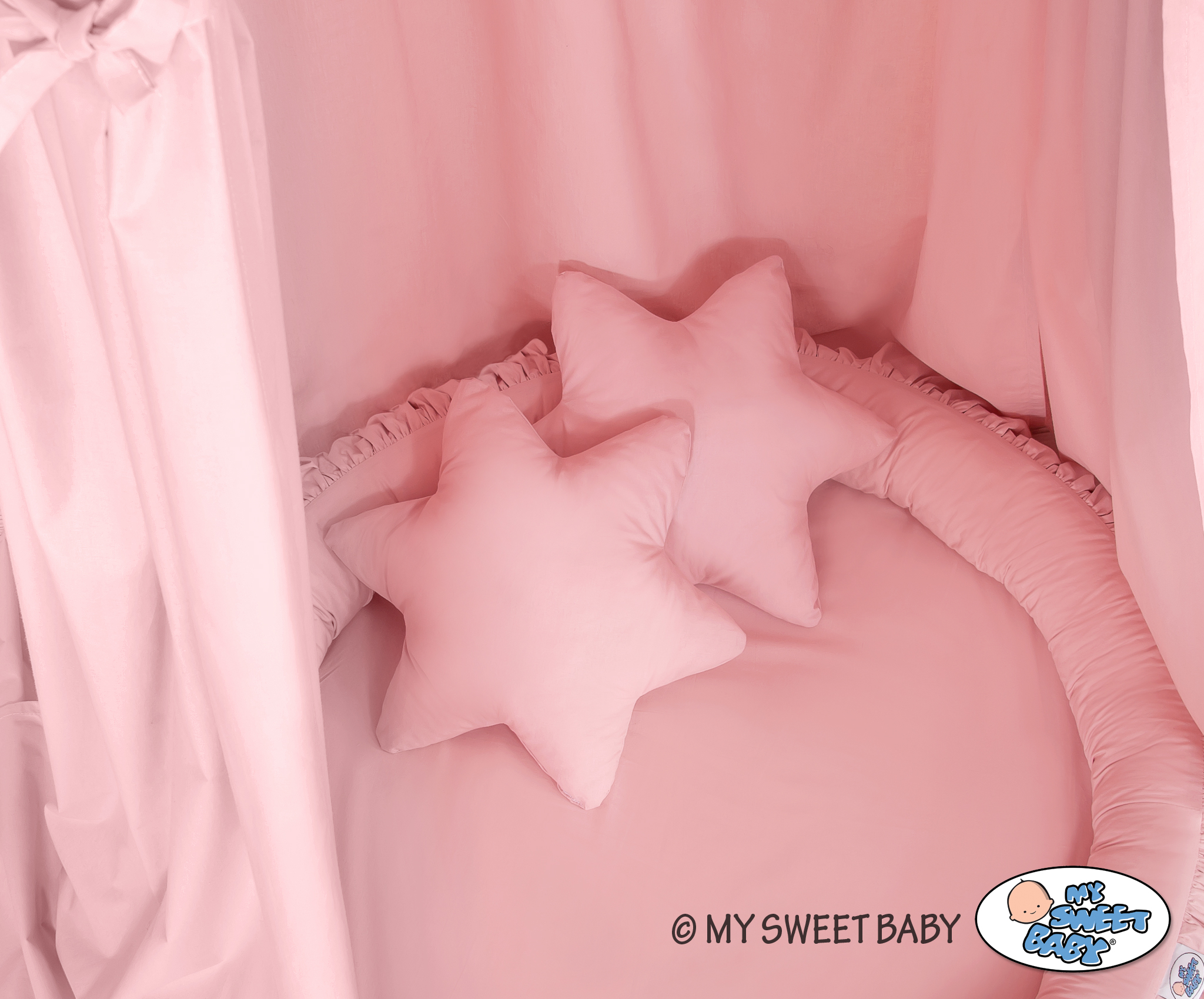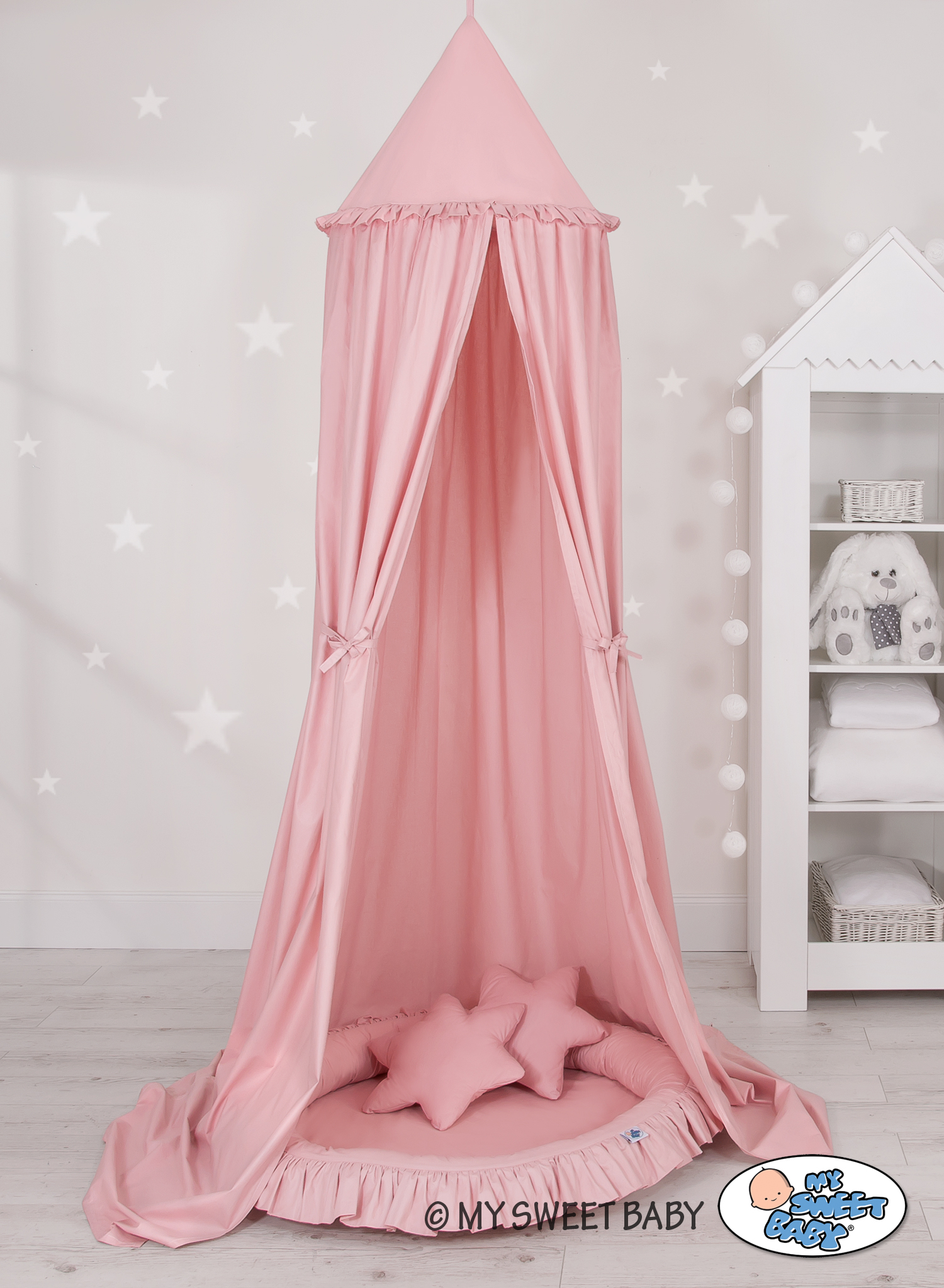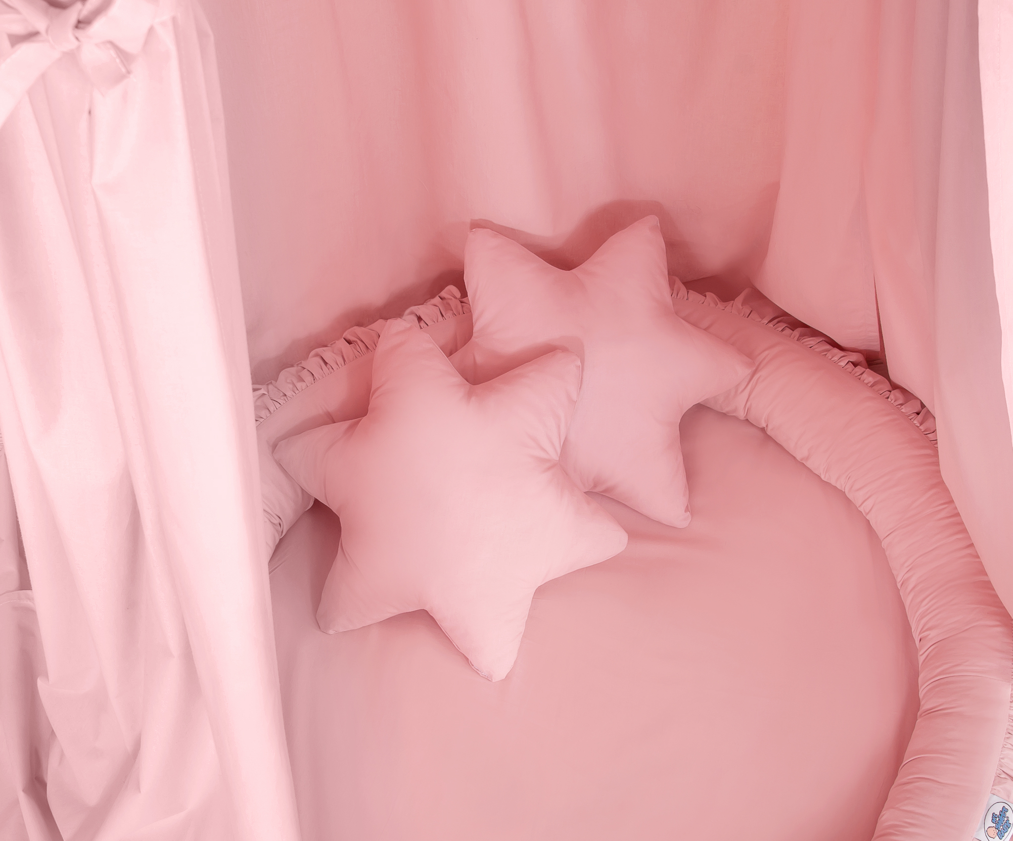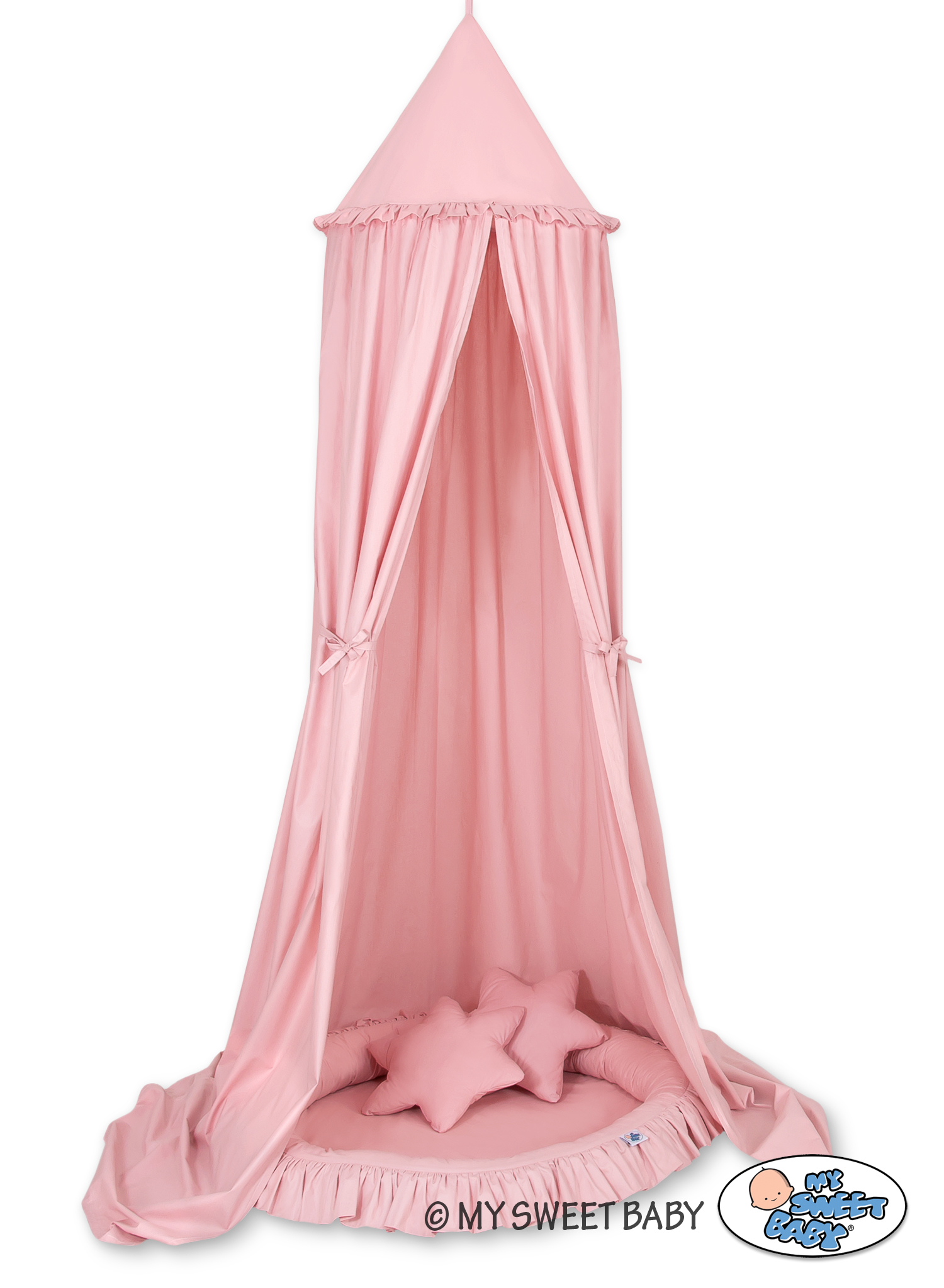 An effective long hanging canopy. A beautiful element it the children's room. It can be used as a unique decoration of a baby cot, as well as it can create a wonderful place to play. Hanging over the cot protect the canopy against too much light and noise creating a cozy and safe place to rest inside the cot. The canopy can be easily mounted to the ceiling. The length of 260 cm allows to arrange the ends on the floor. This creates a perfect hiding place and playground for older children. The canopy is made of Okotex certificated, 100% cotton fabric. On the sides there are practical ribbons for tying the canopy and create a beautiful tent. The rim on the top can be removed. The fabric is washable by 30 Degrees. Combined with lovely nest with a flounce it will become a perfect place for fun. The soft edges provide safety for the babies. The edge is filled with approved, non-allergenic filling: Eco -Fillball fibers. They are soft, resilience and they assure the proper air circulation. The bottom of the baby nest with flounce is made of a modern, anti-allergenic, attested material. The bottom inlay can be removed and the cover can be washed at 30 degrees.