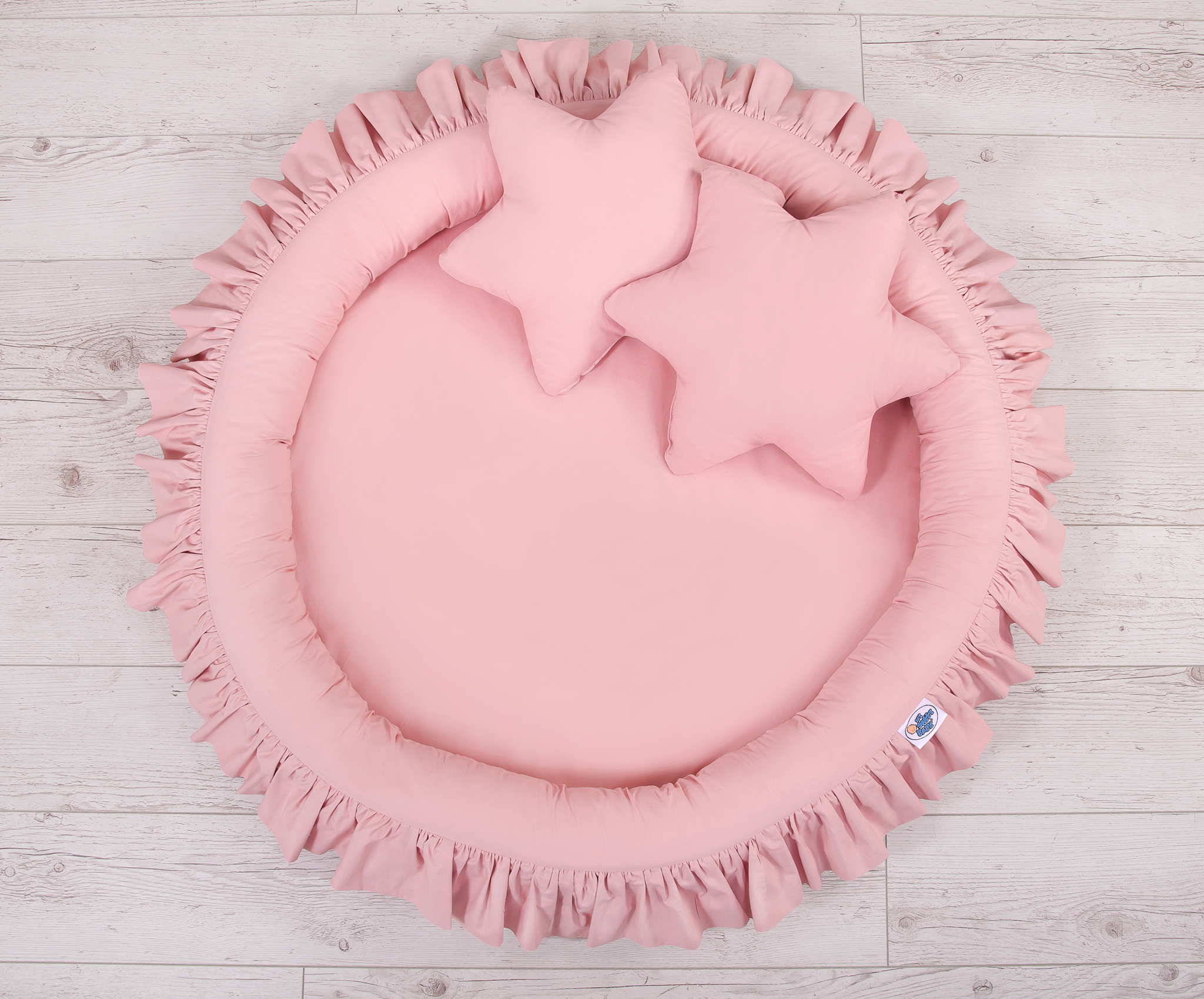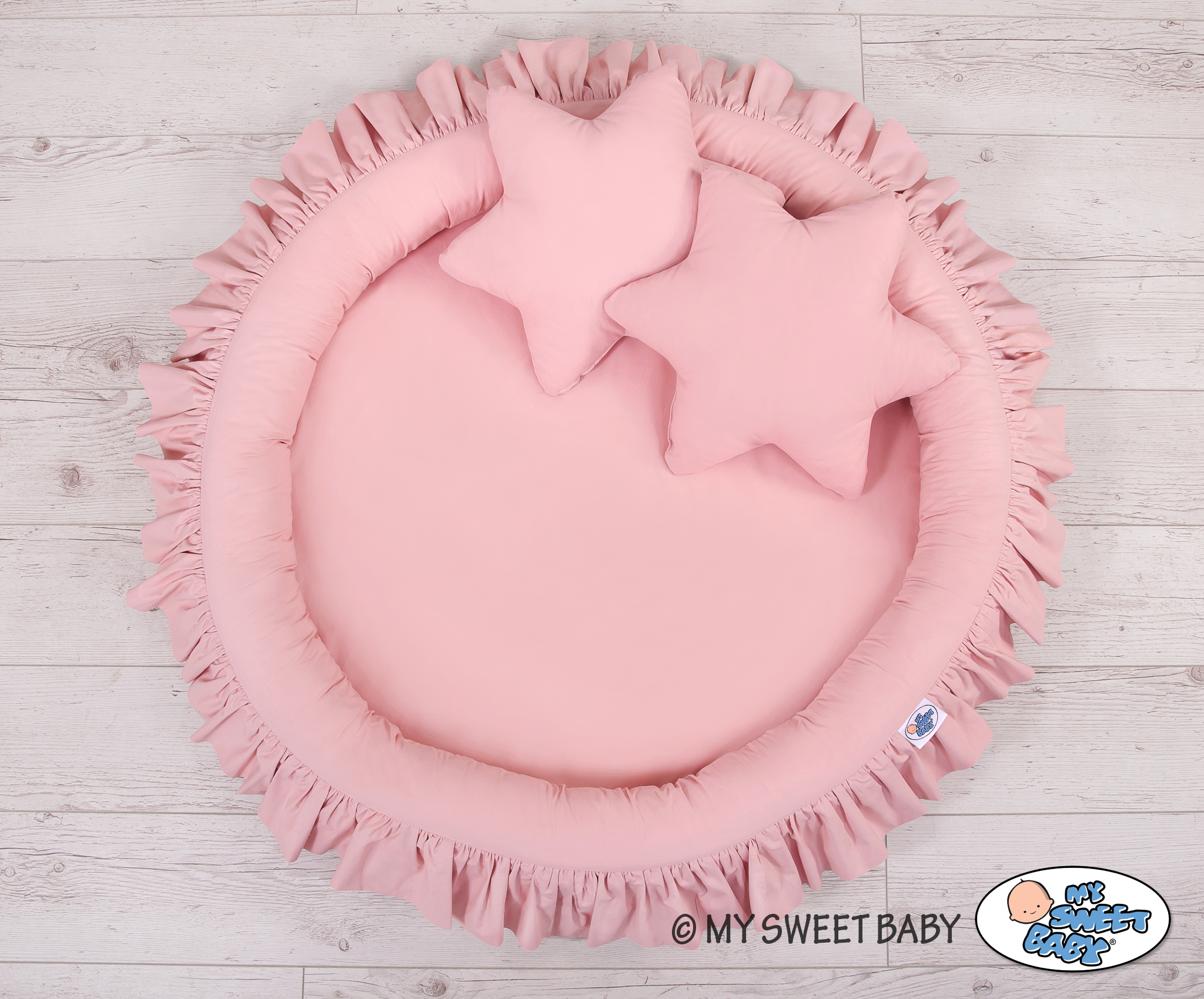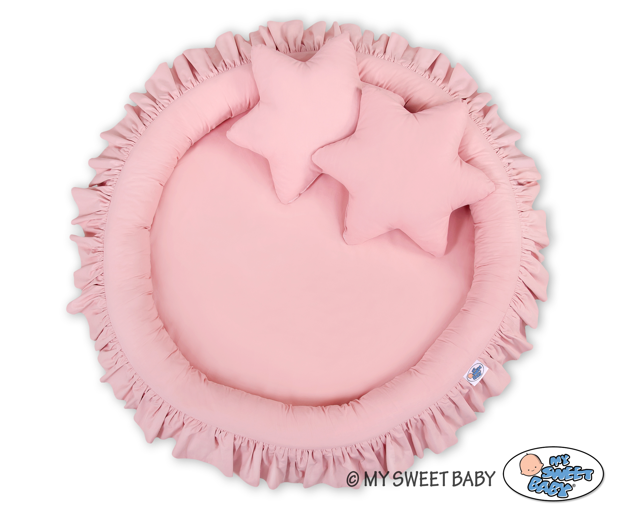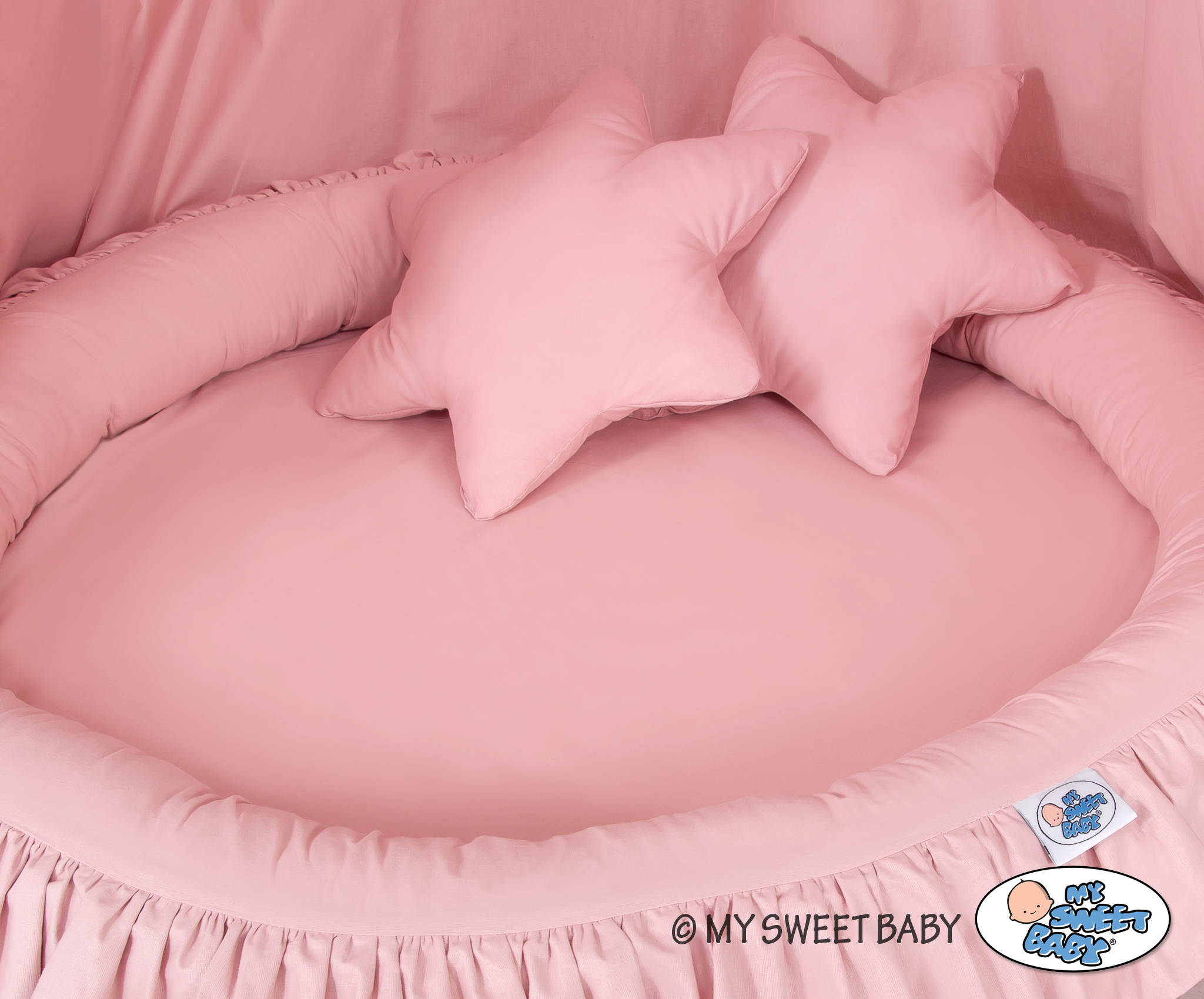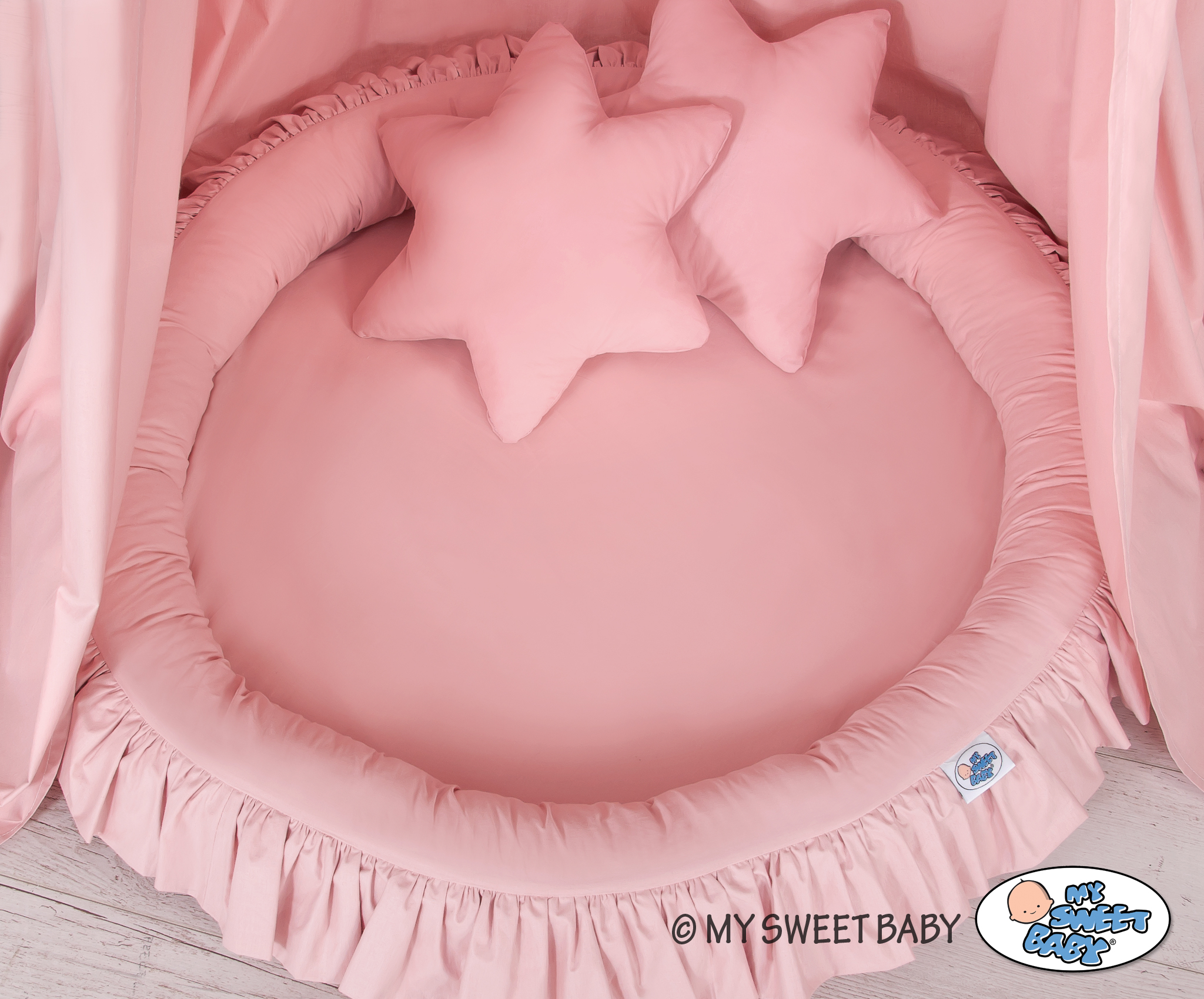 An effective long hanging canopy. A beautiful element it the children's room. It can be used as a unique decoration of a baby cot, as well as it can create a wonderful place to play. Hanging over the cot protect the canopy against too much light and noise creating a cozy and safe place to rest inside the cot. The canopy can be easily mounted to the ceiling. The length of 260 cm allows to arrange the ends on the floor. This creates a perfect hiding place and playground for older children. The canopy is made of Okotex certificated, 100% cotton fabric. On the sides there are practical ribbons for tying the canopy and create a beautiful tent. The rim on the top can be removed. The fabric is washable by 30 Degrees. Combined with lovely nest with a flounce it will become a perfect place for fun. The soft edges provide safety for the babies. The edge is filled with approved, non-allergenic filling: Eco -Fillball fibers. They are soft, resilience and they assure the proper air circulation. The bottom of the baby nest with flounce is made of a modern, anti-allergenic, attested material. The bottom inlay can be removed and the cover can be washed at 30 degrees.