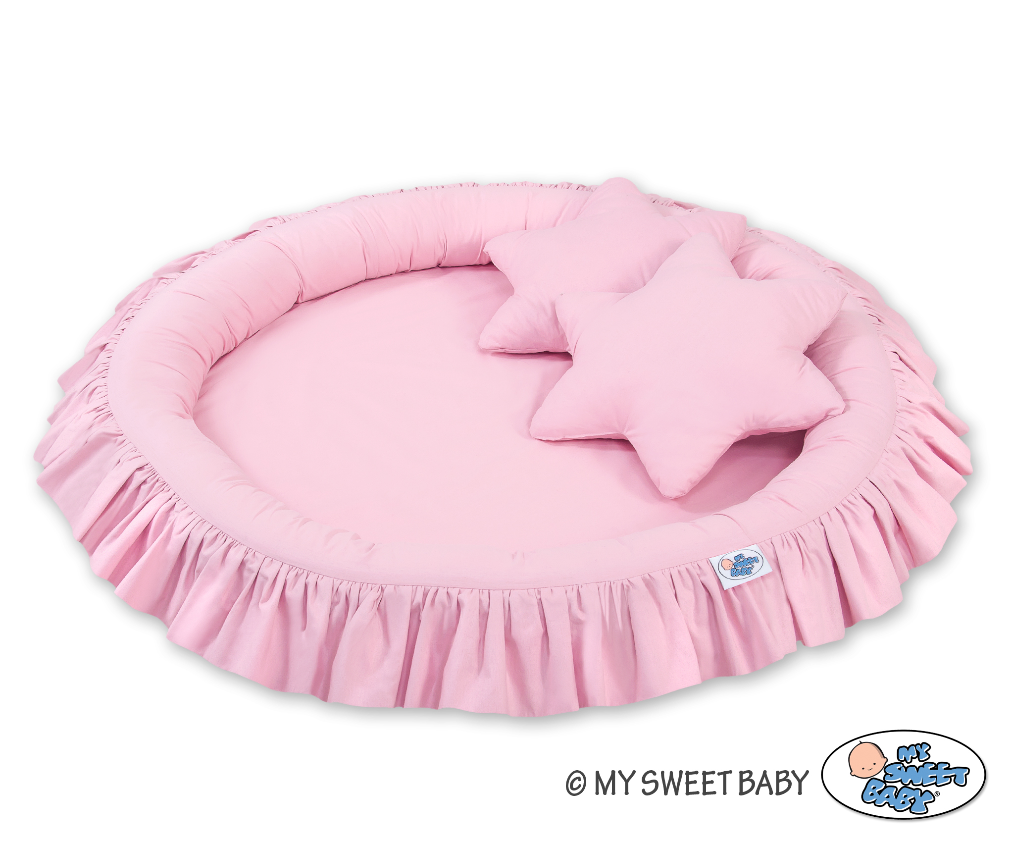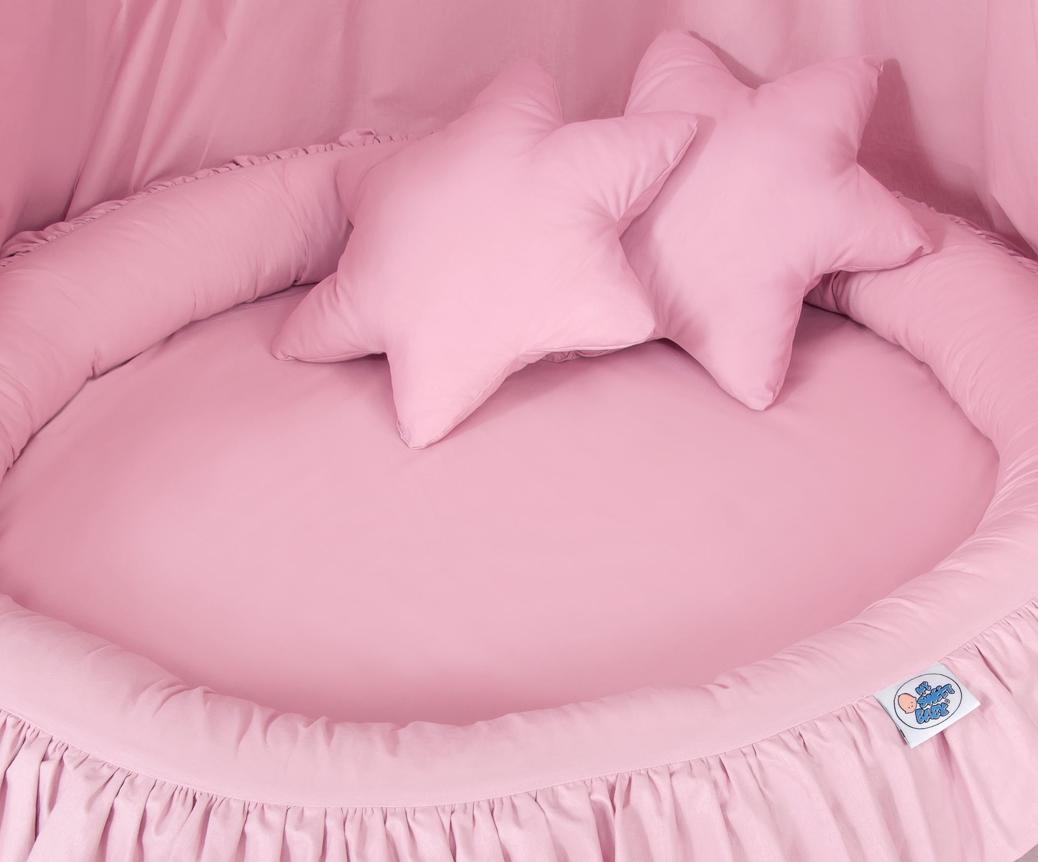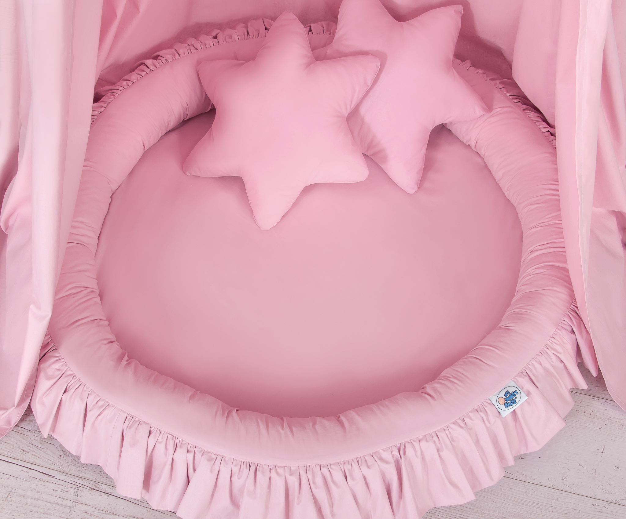 An effective long hanging canopy. A beautiful element it the children's room. It can be used as a unique decoration of a baby cot, as well as it can create a wonderful place to play. Hanging over the cot protect the canopy against too much light and noise creating a cozy and safe place to rest inside the cot. The canopy can be easily mounted to the ceiling. The length of 260 cm allows to arrange the ends on the floor. This creates a perfect hiding place and playground for older children. The canopy is made of Okotex certificated, 100% cotton fabric. On the sides there are practical ribbons for tying the canopy and create a beautiful tent. The rim on the top can be removed. The fabric is washable by 30 Degrees. Combined with lovely nest with a flounce it will become a perfect place for fun. The soft edges provide safety for the babies. The edge is filled with approved, non-allergenic filling: Eco -Fillball fibers. They are soft, resilience and they assure the proper air circulation. The bottom of the baby nest with flounce is made of a modern, anti-allergenic, attested material. The bottom inlay can be removed and the cover can be washed at 30 degrees.