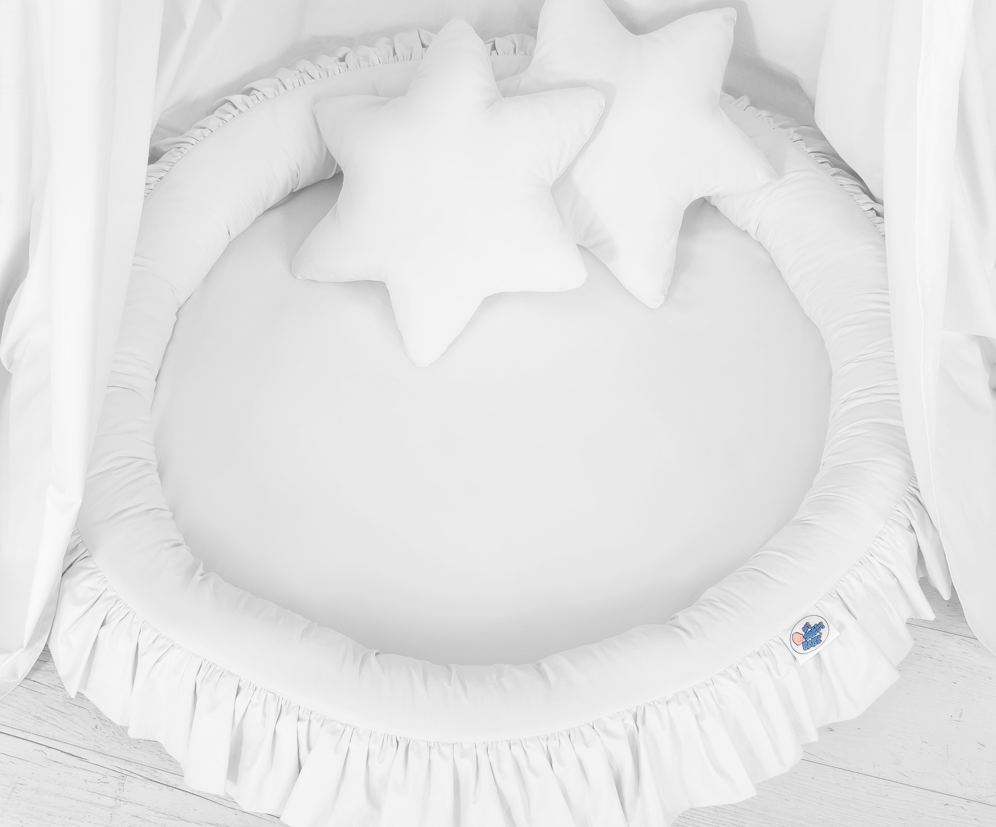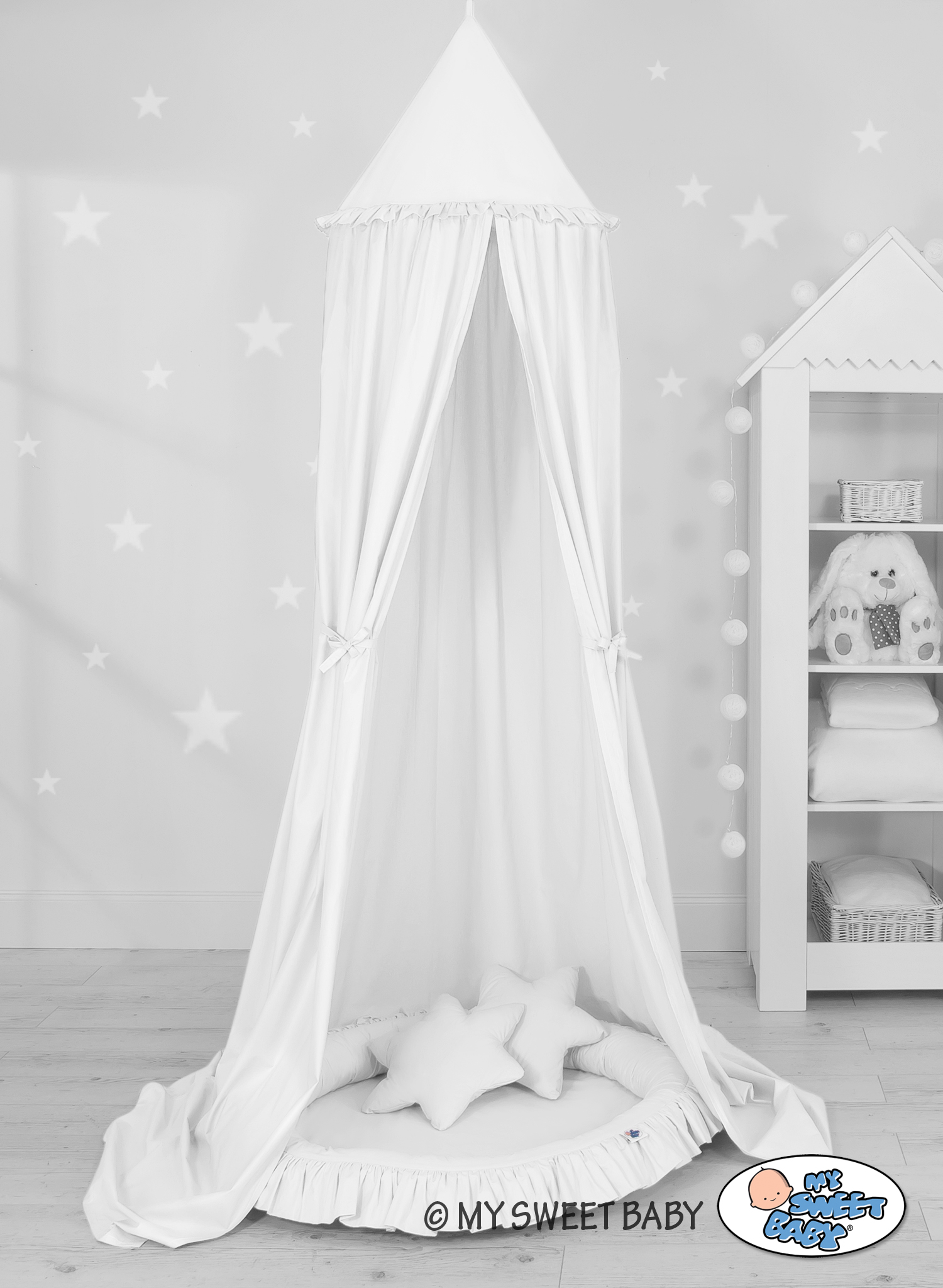 An effective long hanging canopy. A beautiful element it the children's room. It can be used as a unique decoration of a baby cot, as well as it can create a wonderful  place to play. Hanging over the cot protect the canopy against too much light and noise creating a cozy  and safe place to rest inside the cot. The canopy can be easily mounted to the ceiling. The length of 260 cm allows to arrange the ends on the floor. This creates a perfect hiding place and playground for older children. The canopy is made of Okotex certificated, 100% cotton fabric. On the sides there are practical ribbons for tying the canopy and create a beautiful tent. The rim on the top can be removed. The fabric is washable by 30 Degrees. Combined with lovely nest with a flounce it will become a perfect place for fun. The soft edges provide safety for the babies. The edge is filled with approved, non-allergenic filling: Eco -Fillball fibers. They are soft, resilience and they assure the proper air circulation. The bottom of the baby nest with flounce is made of a modern, anti-allergenic, attested material. The bottom inlay can be removed and the cover can be washed at 30 degrees.
