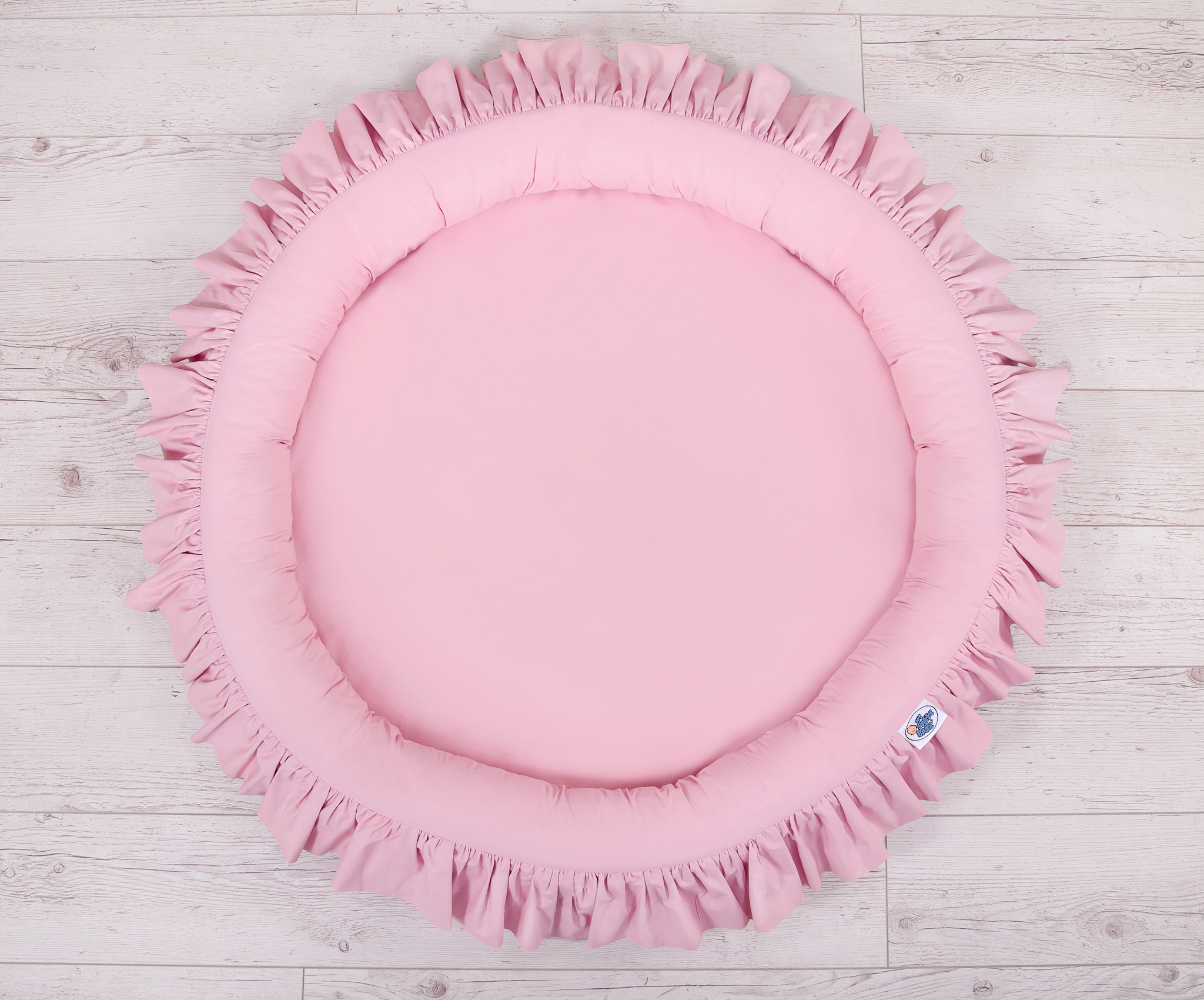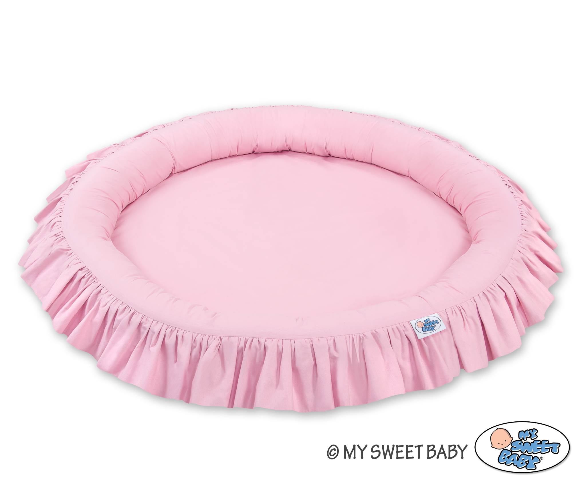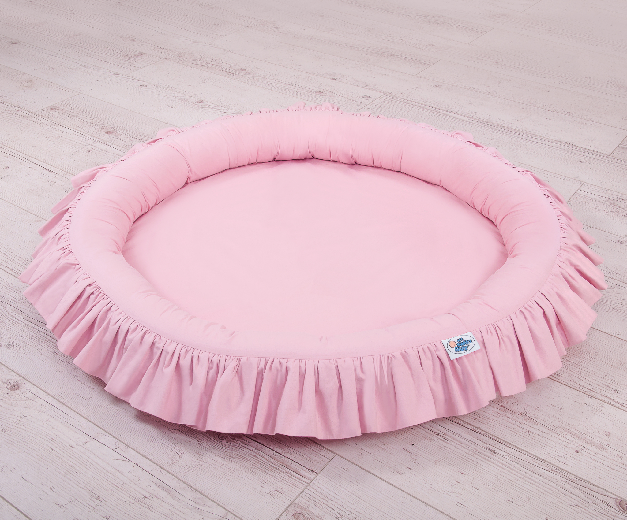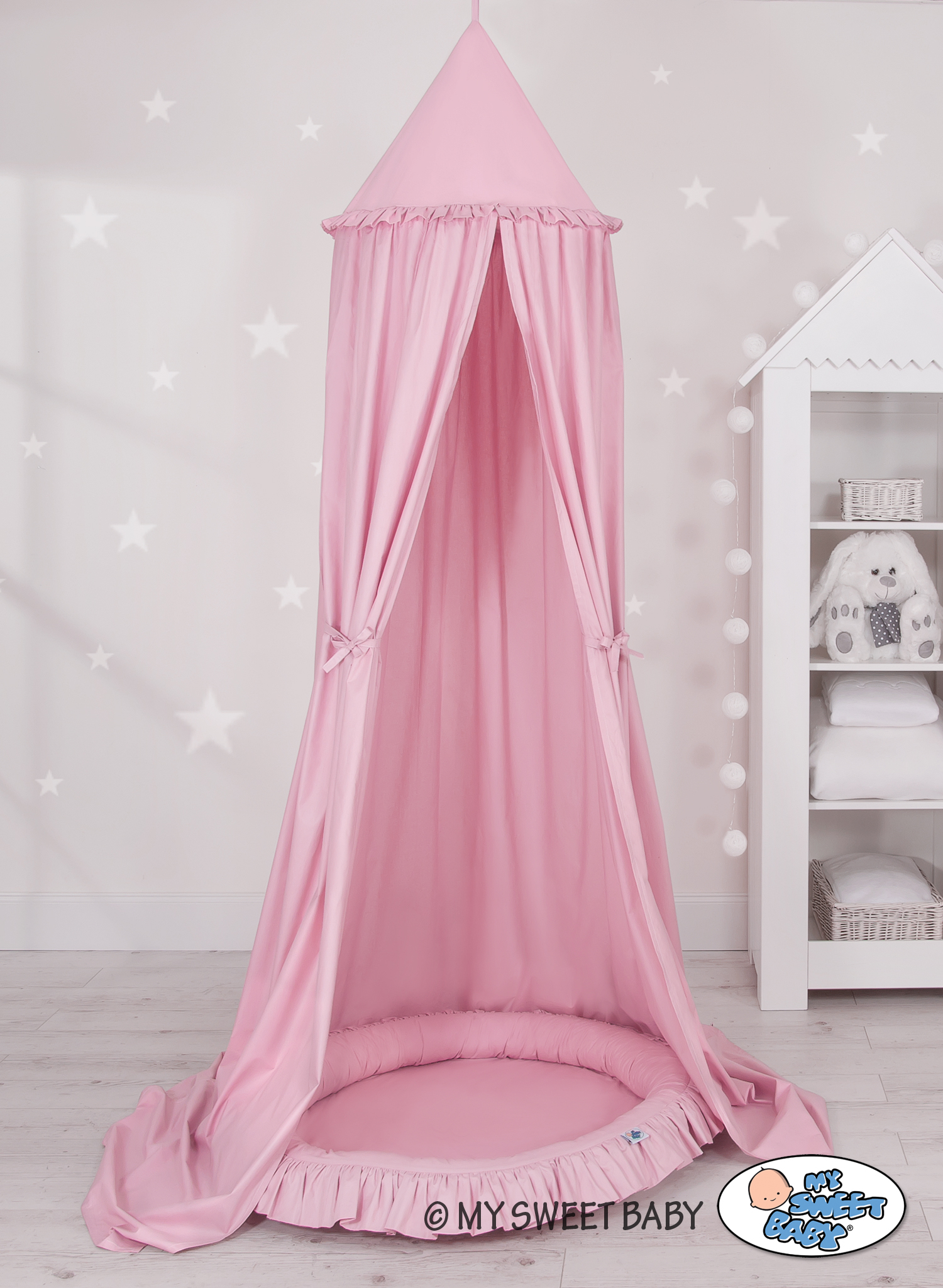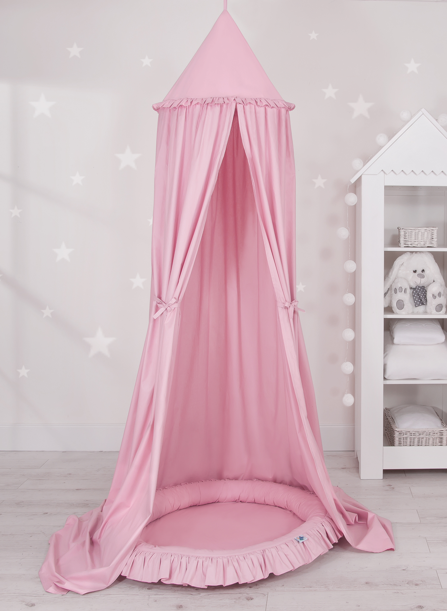 An effective long hanging canopy. A beautiful element it the children's room. It can be used as a unique decoration of a baby cot, as well as it can create a wonderful  place to play. Hanging over the cot protect the canopy against too much light and noise creating a cozy  and safe place to rest inside the cot. The canopy can be easily mounted to the ceiling. The length of 260 cm allows to arrange the ends on the floor. This creates a perfect hiding place and playground for older children. The canopy is made of Okotex certificated, 100% cotton fabric. On the sides there are practical ribbons for tying the canopy and create a beautiful tent. The rim on the top can be removed. The fabric is washable by 30 Degrees. Combined with lovely nest with a flounce it will become a perfect place for fun. The soft edges provide safety for the babies. The edge is filled with approved, non-allergenic filling: Eco -Fillball fibers. They are soft, resilience and they assure the proper air circulation. The bottom of the baby nest with flounce is made of a modern, anti-allergenic, attested material. The bottom inlay can be removed and the cover can be washed at 30 degrees