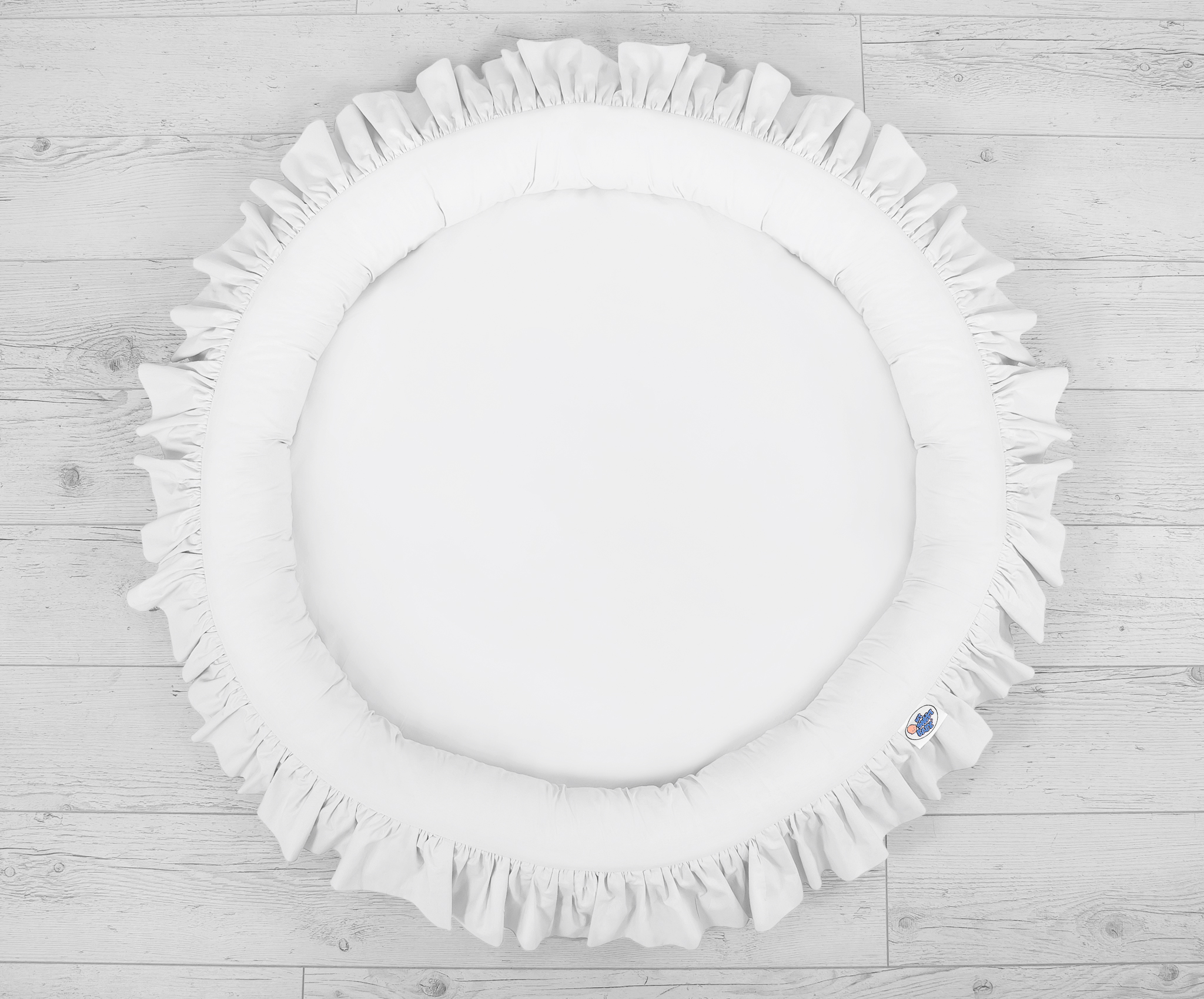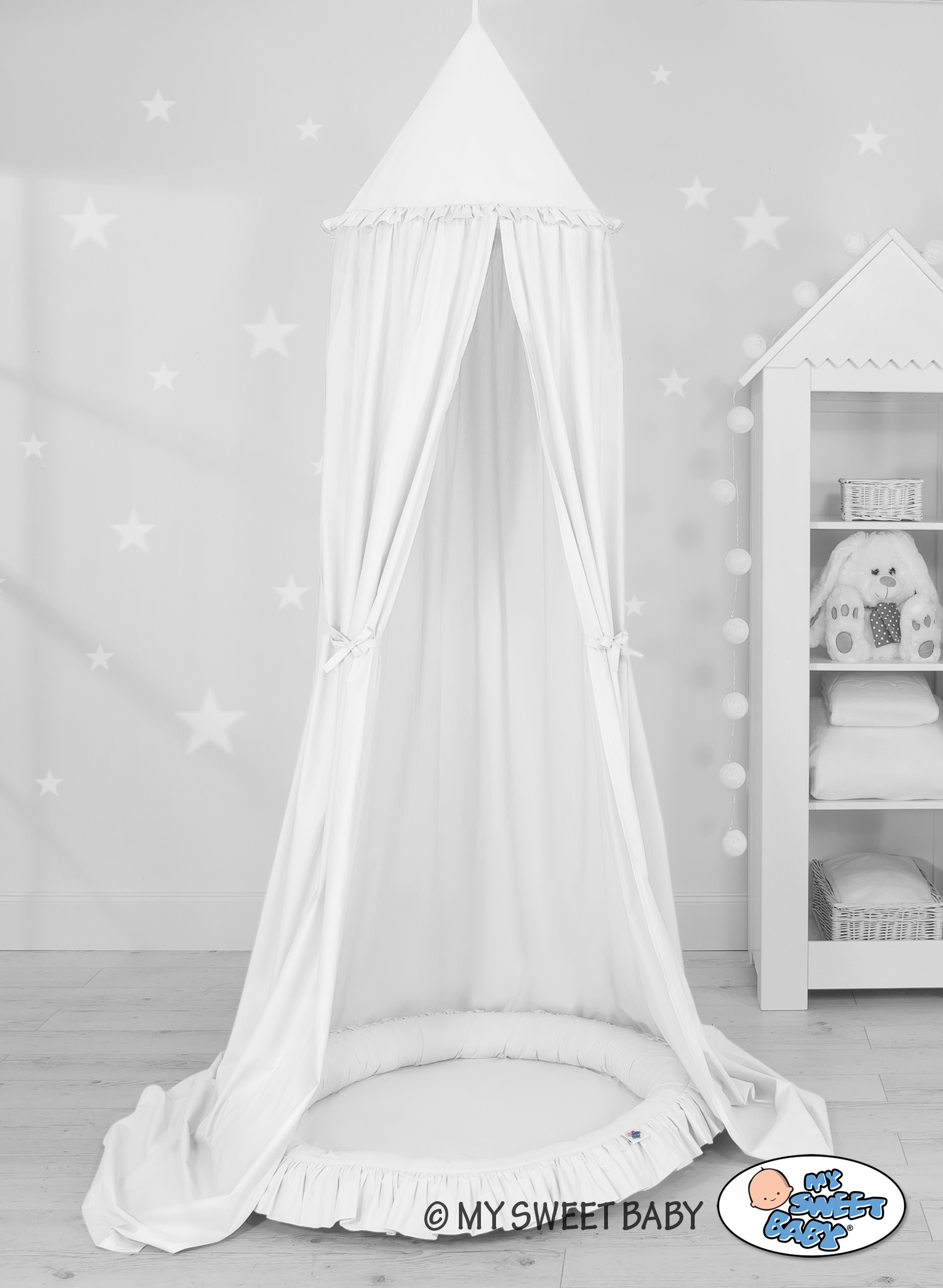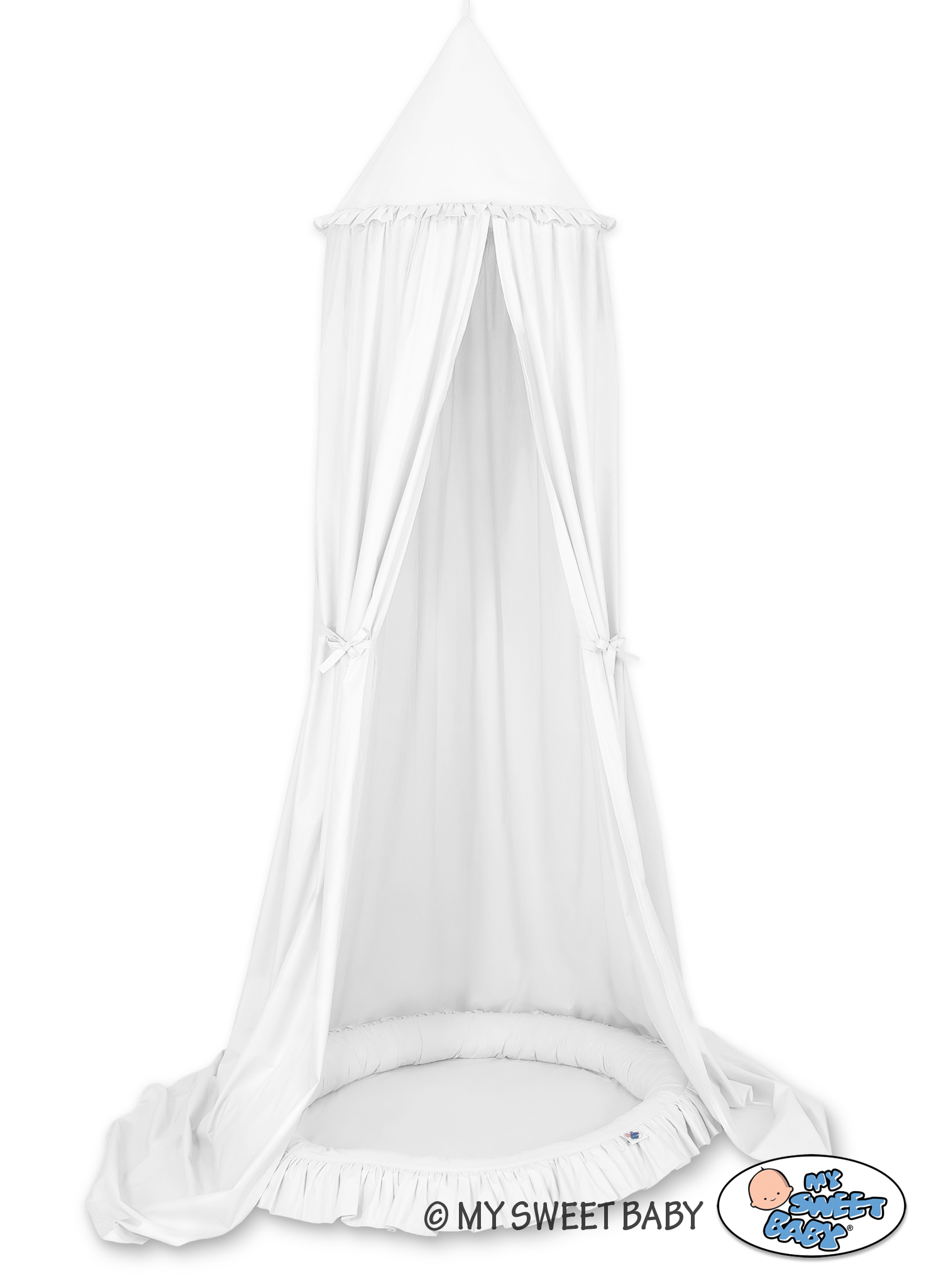 An effective long hanging canopy. A beautiful element it the children's room. It can be used as a unique decoration of a baby cot, as well as it can create a wonderful  place to play. Hanging over the cot protect the canopy against too much light and noise creating a cozy  and safe place to rest inside the cot. The canopy can be easily mounted to the ceiling. The length of 260 cm allows to arrange the ends on the floor. This creates a perfect hiding place and playground for older children. The canopy is made of Okotex certificated, 100% cotton fabric. On the sides there are practical ribbons for tying the canopy and create a beautiful tent. The rim on the top can be removed. The fabric is washable by 30 Degrees. Combined with lovely nest with a flounce it will become a perfect place for fun. The soft edges provide safety for the babies. The edge is filled with approved, non-allergenic filling: Eco -Fillball fibers. They are soft, resilience and they assure the proper air circulation. The bottom of the baby nest with flounce is made of a modern, anti-allergenic, attested material. The bottom inlay can be removed and the cover can be washed at 30 degrees