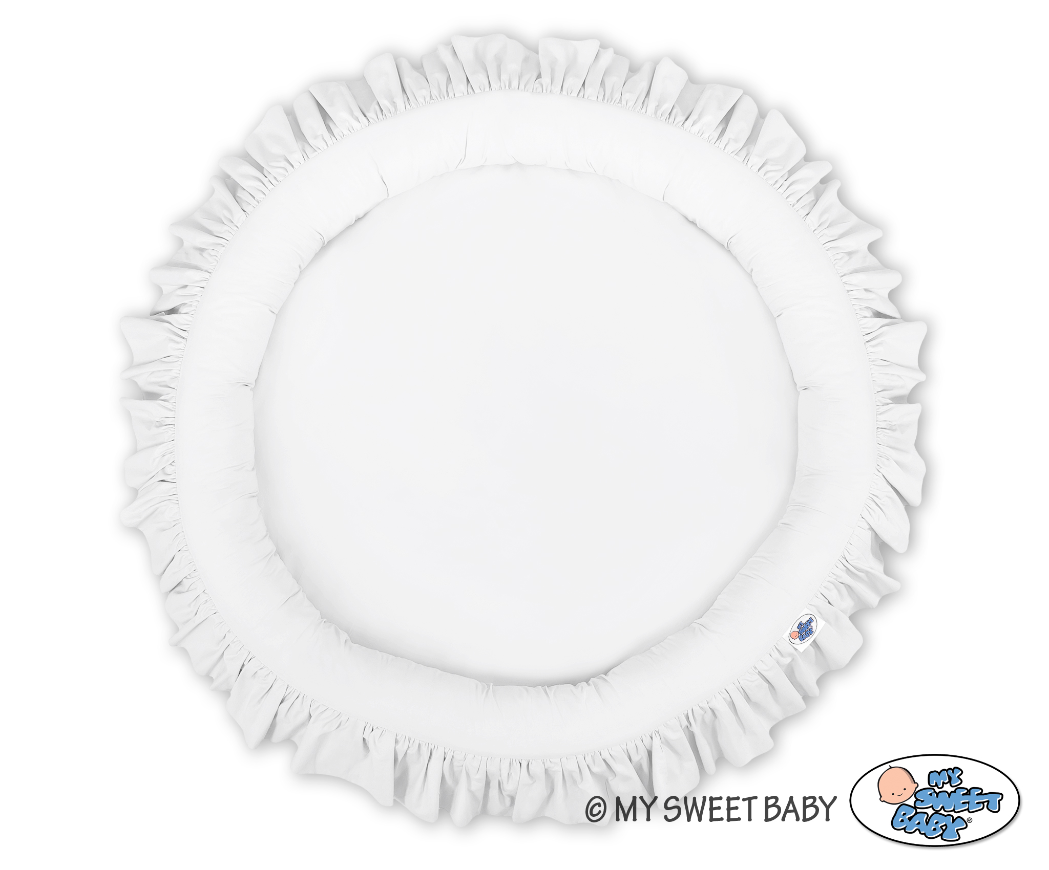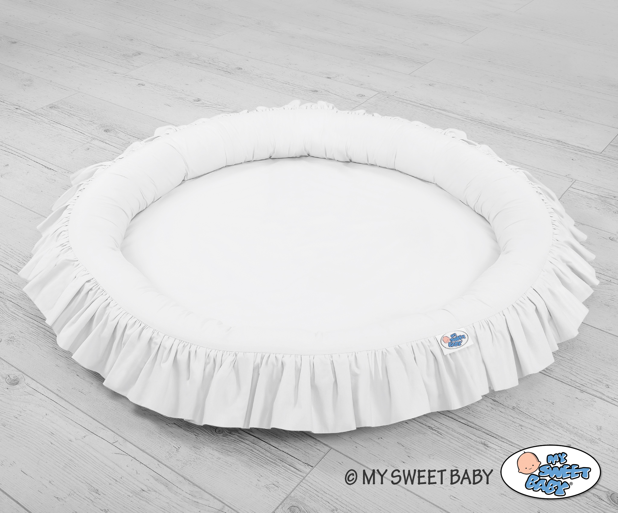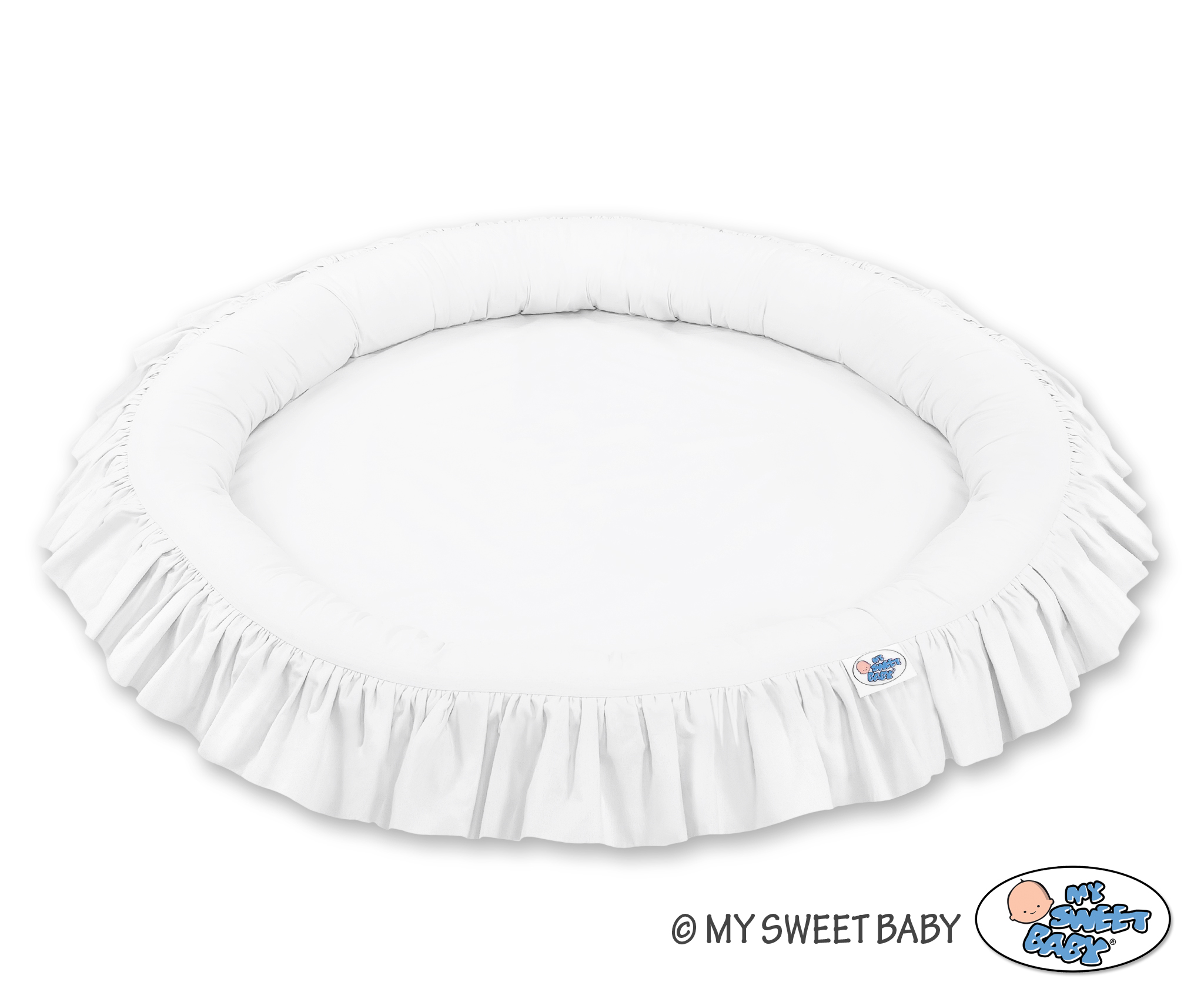 An effective long hanging canopy. A beautiful element it the children's room. It can be used as a unique decoration of a baby cot, as well as it can create a wonderful  place to play. Hanging over the cot protect the canopy against too much light and noise creating a cozy  and safe place to rest inside the cot. The canopy can be easily mounted to the ceiling. The length of 260 cm allows to arrange the ends on the floor. This creates a perfect hiding place and playground for older children. The canopy is made of Okotex certificated, 100% cotton fabric. On the sides there are practical ribbons for tying the canopy and create a beautiful tent. The rim on the top can be removed. The fabric is washable by 30 Degrees. Combined with lovely nest with a flounce it will become a perfect place for fun. The soft edges provide safety for the babies. The edge is filled with approved, non-allergenic filling: Eco -Fillball fibers. They are soft, resilience and they assure the proper air circulation. The bottom of the baby nest with flounce is made of a modern, anti-allergenic, attested material. The bottom inlay can be removed and the cover can be washed at 30 degrees