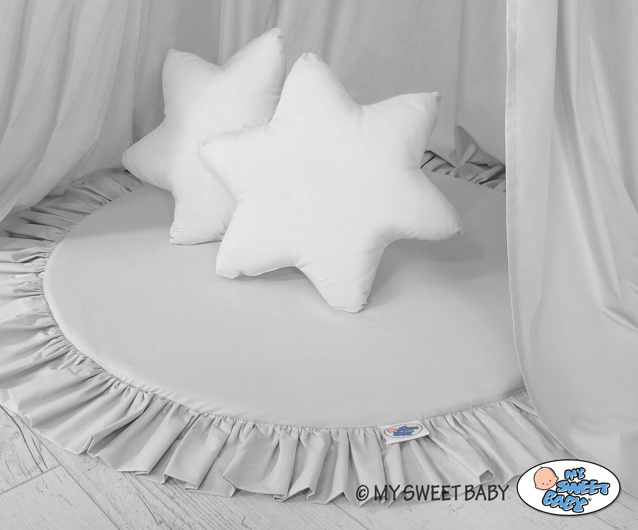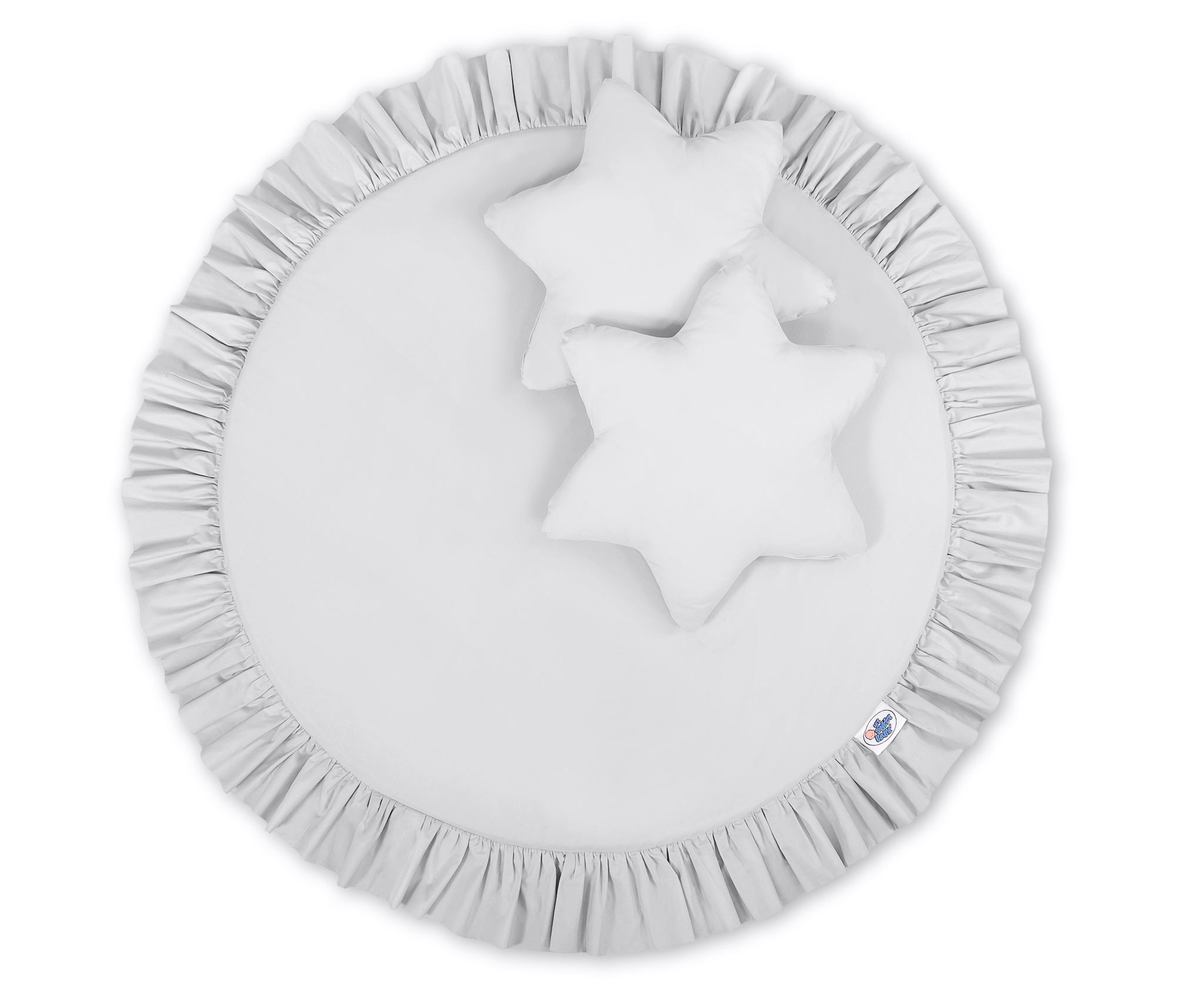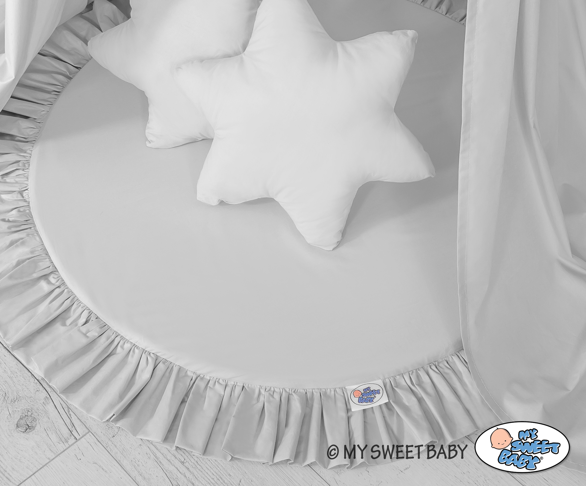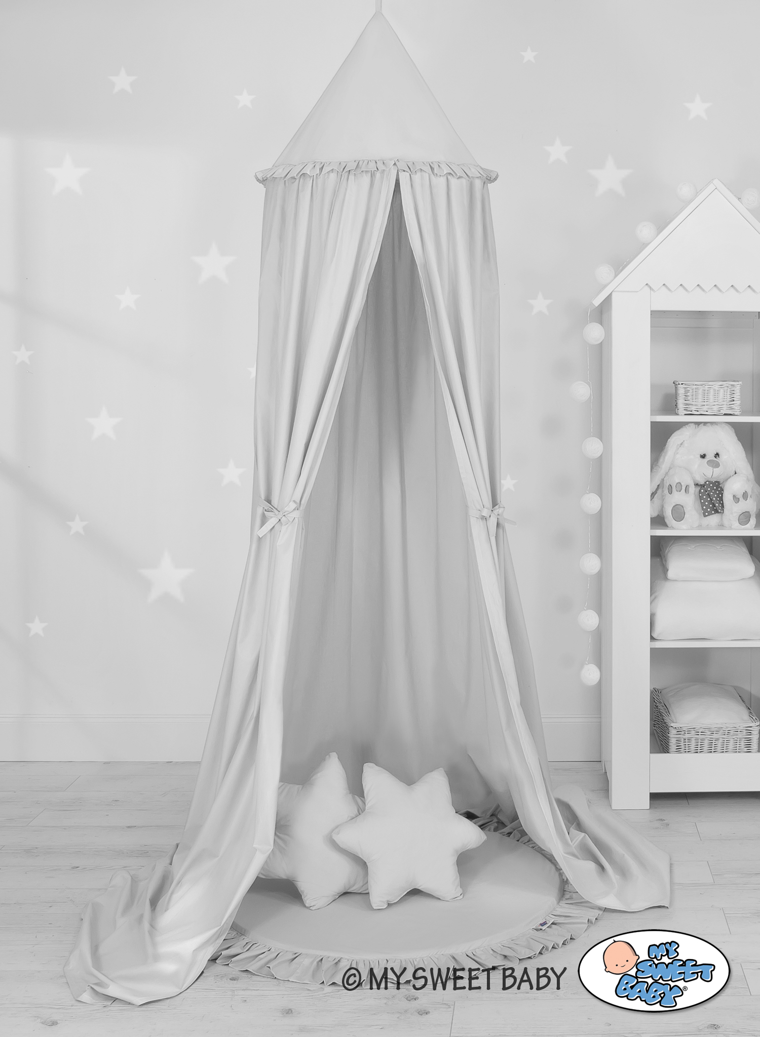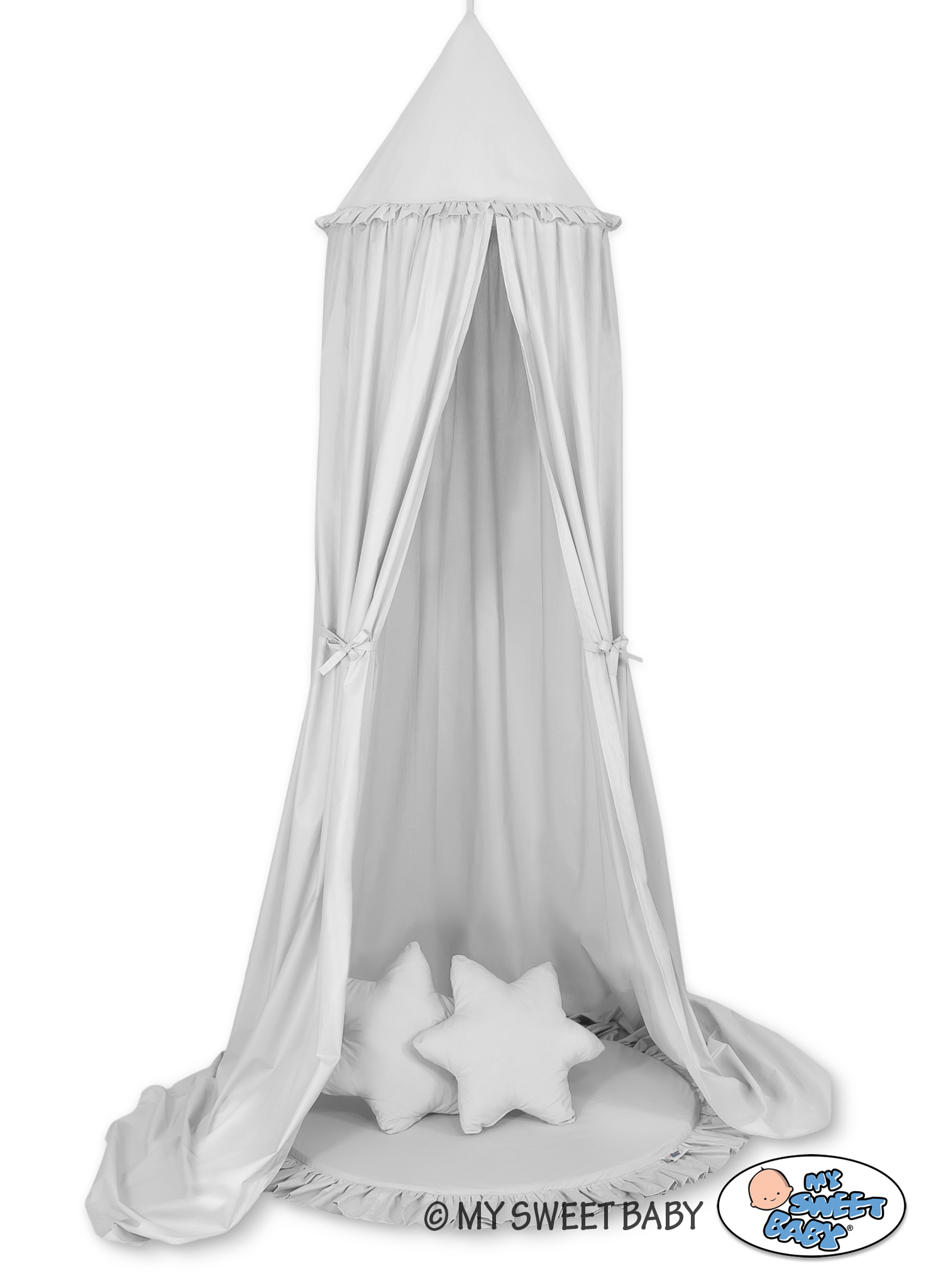 An effective long hanging canopy. A beautiful element it the children's room. It can be used as a unique decoration of a baby cot, as well as it can create a wonderful place to play. Hanging over the cot protect the canopy against too much light and noise creating a cozy and safe place to rest inside the cot. The canopy can be easily mounted to the ceiling. The length of 260 cm allows to arrange the ends on the floor. This creates a perfect hiding place and playground for older children. The canopy is made of Okotex certificated, 100% cotton fabric. On the sides there are practical ribbons for tying the canopy and create a beautiful tent. The rim on the top can be removed. The fabric is washable by 30 Degrees. Combined with soft and comfy floor mat it will become a perfect place for fun. The mat has a soft filling that perfectly isolates from the hard and cold floor. The cover is made of OKOTEX certified 100% cotton. The bottom of the play mat is made of a modern, anti-allergic, attested material. The bottom can be removed and the cover can be washed.