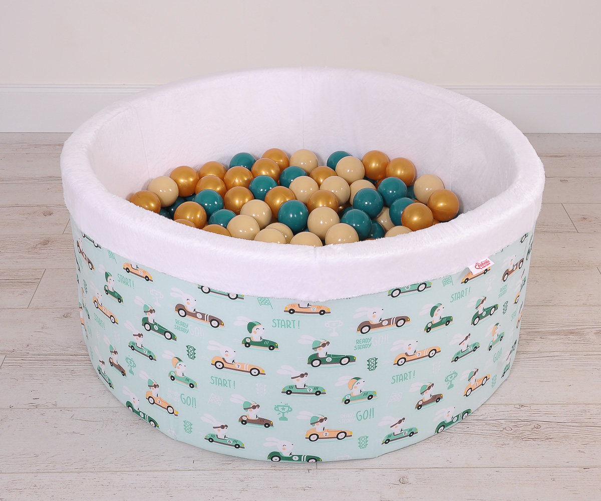 The pool is round with a diameter of 90cm. Side height - 40cm. Made of soft foam. Removable, zippered cover made of 100% cotton and soft minky fleece.