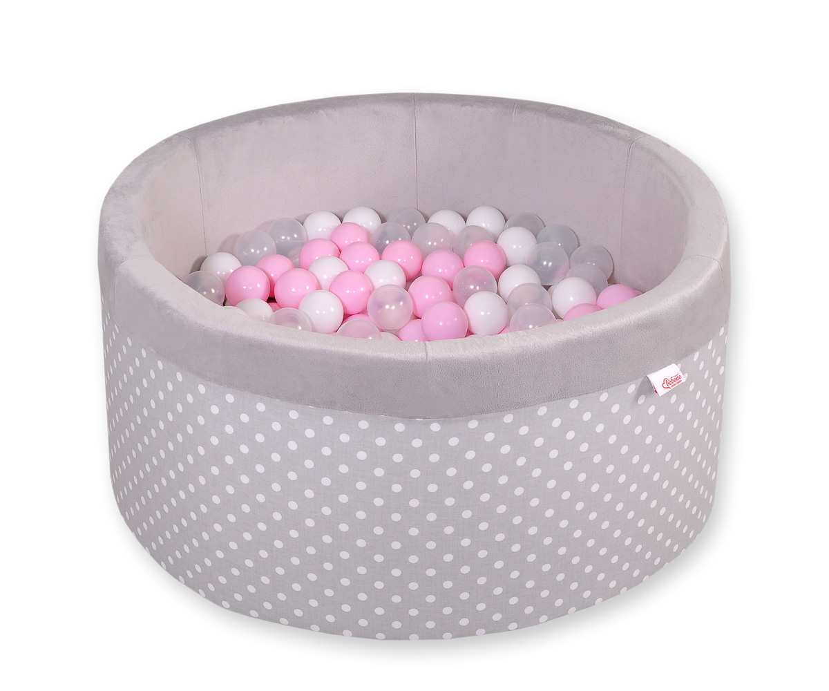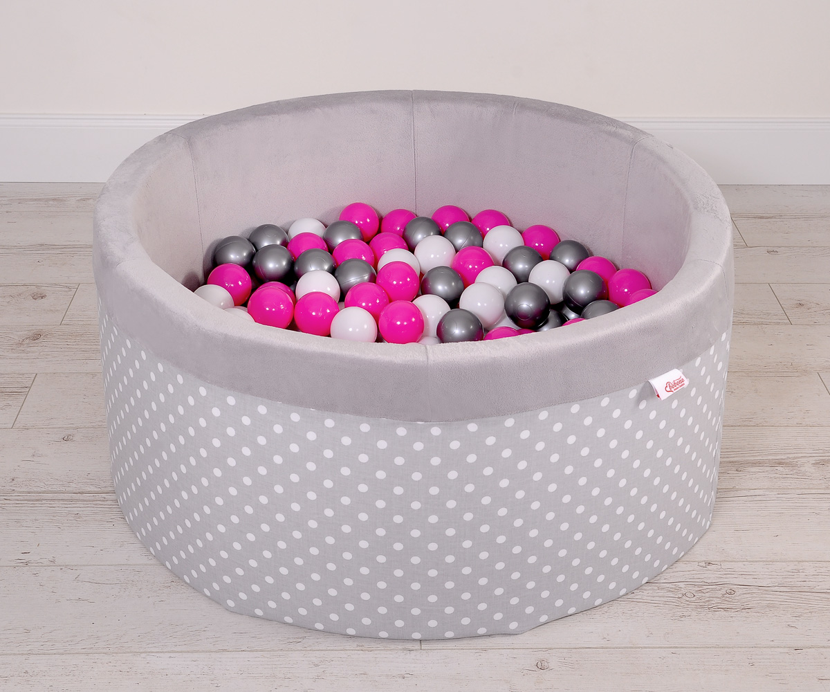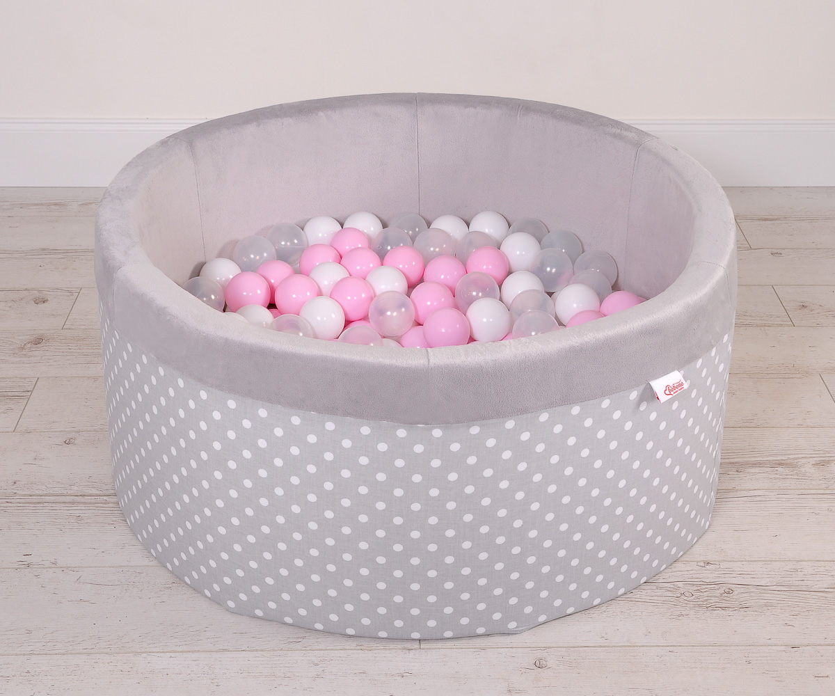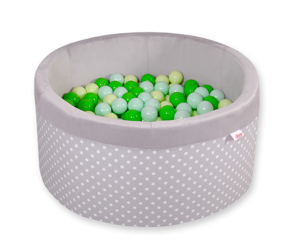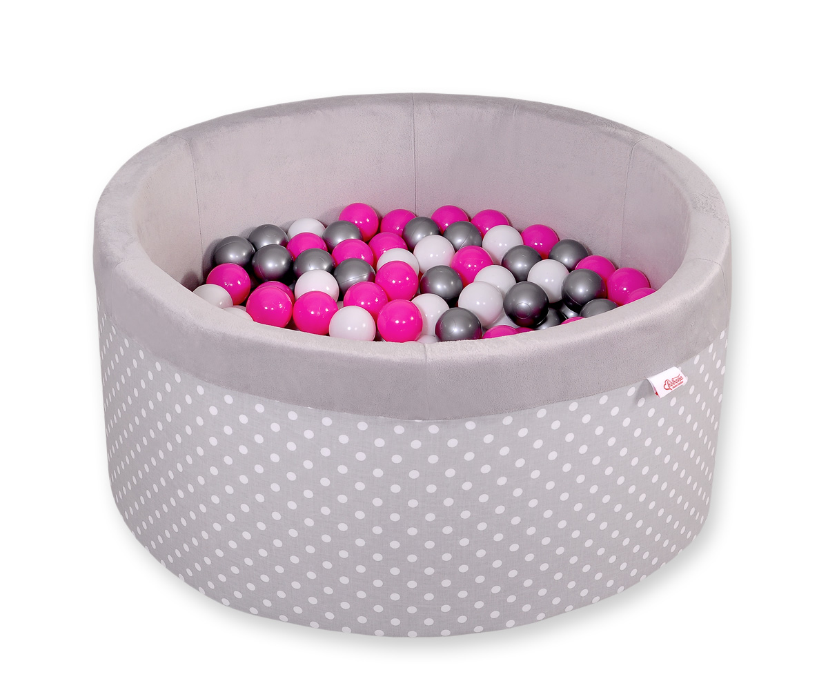 Toddlers Ball-pit minky with balls 200pcs - white dots on Gray Ball pit with colorful balls. It is suitable for playing both at home and in the open air. It is ideal not only for fun but it provides comfort, stimulation and helps develop hand eye coordination and it is positive for the child's development.