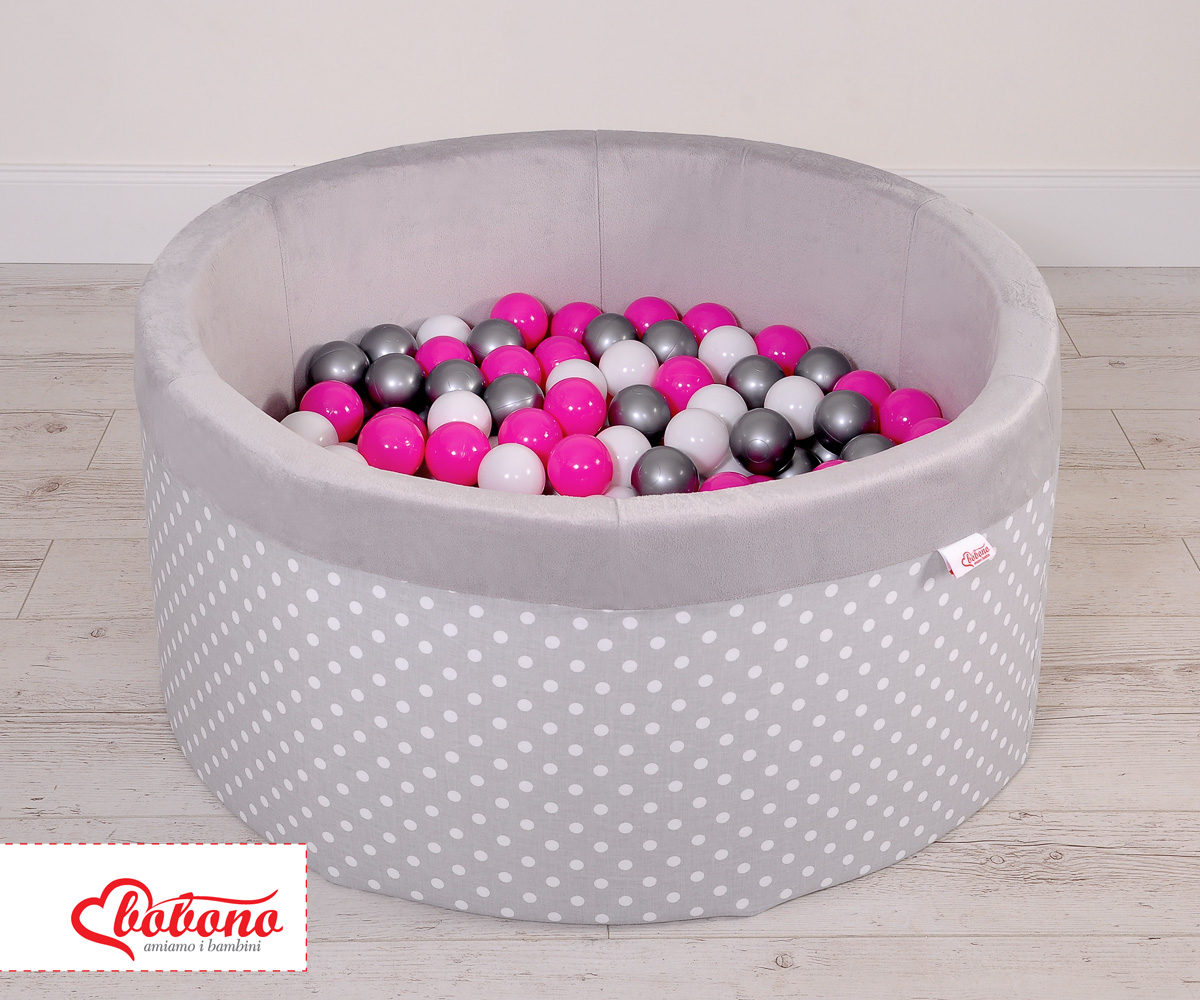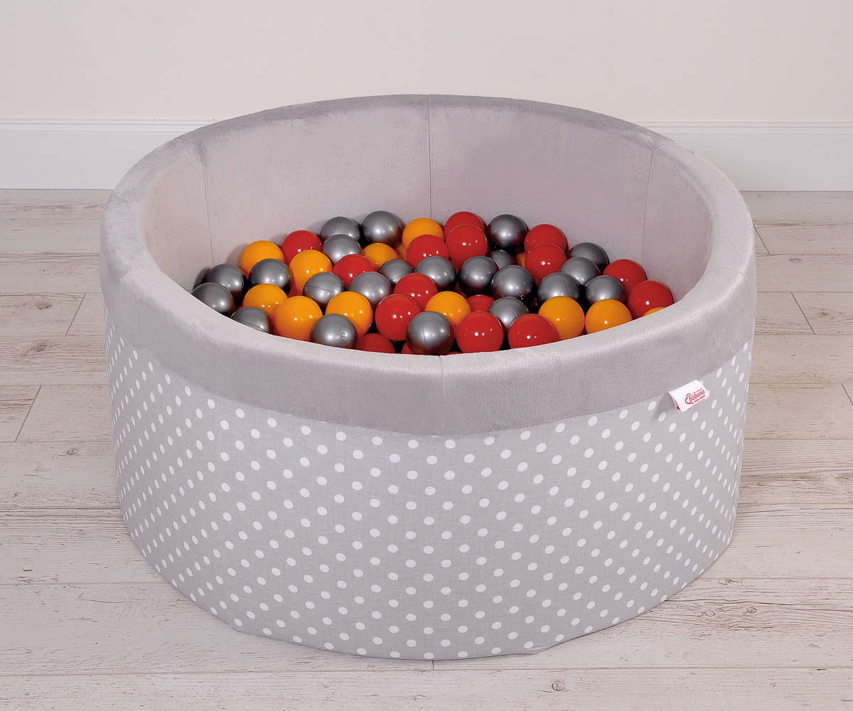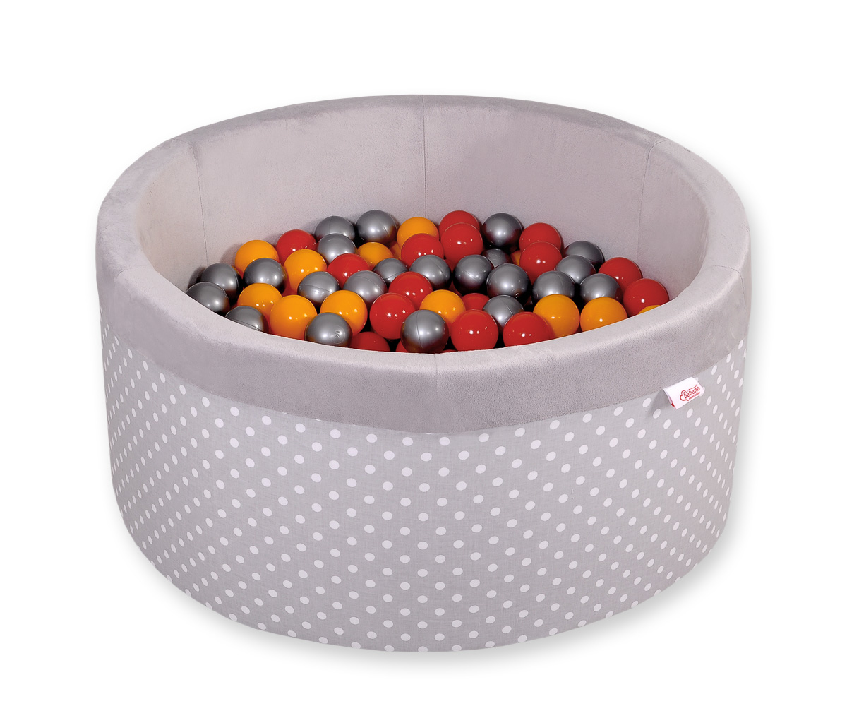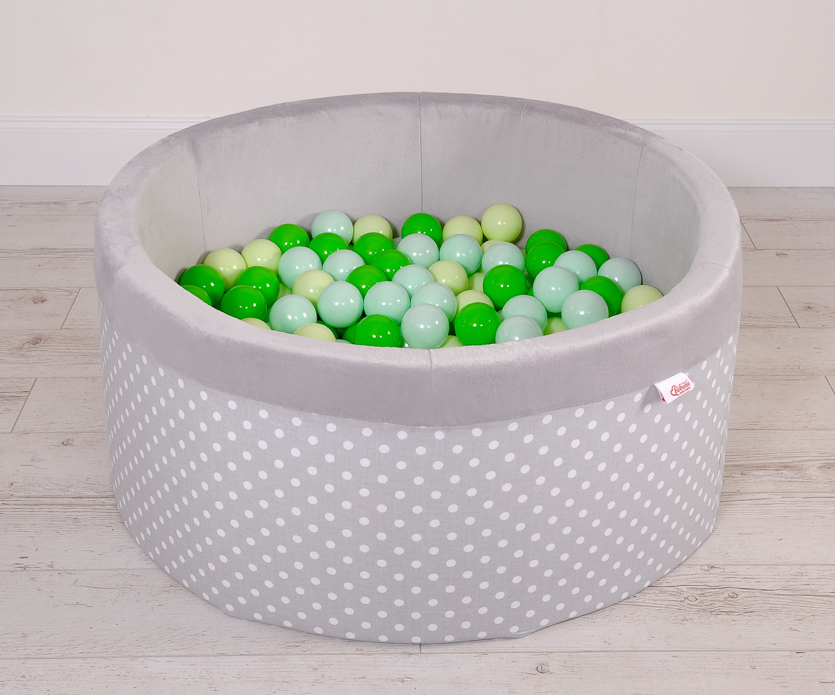 Toddlers Ball-pit minky with balls 200pcs - white dots on Gray Ball pit with colorful balls. It is suitable for playing both at home and in the open air. It is ideal not only for fun but it provides comfort, stimulation and helps develop hand eye coordination and it is positive for the child's development.