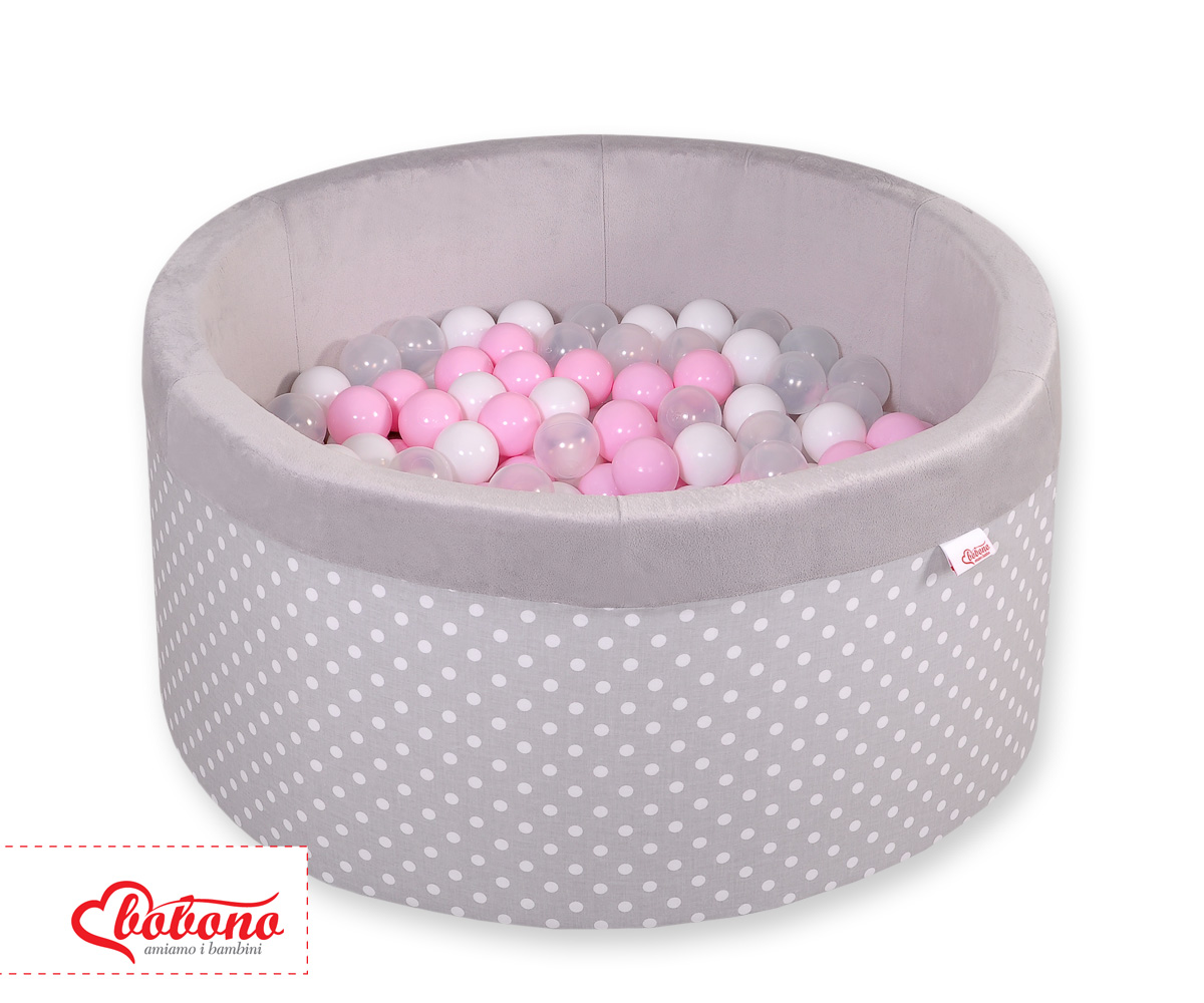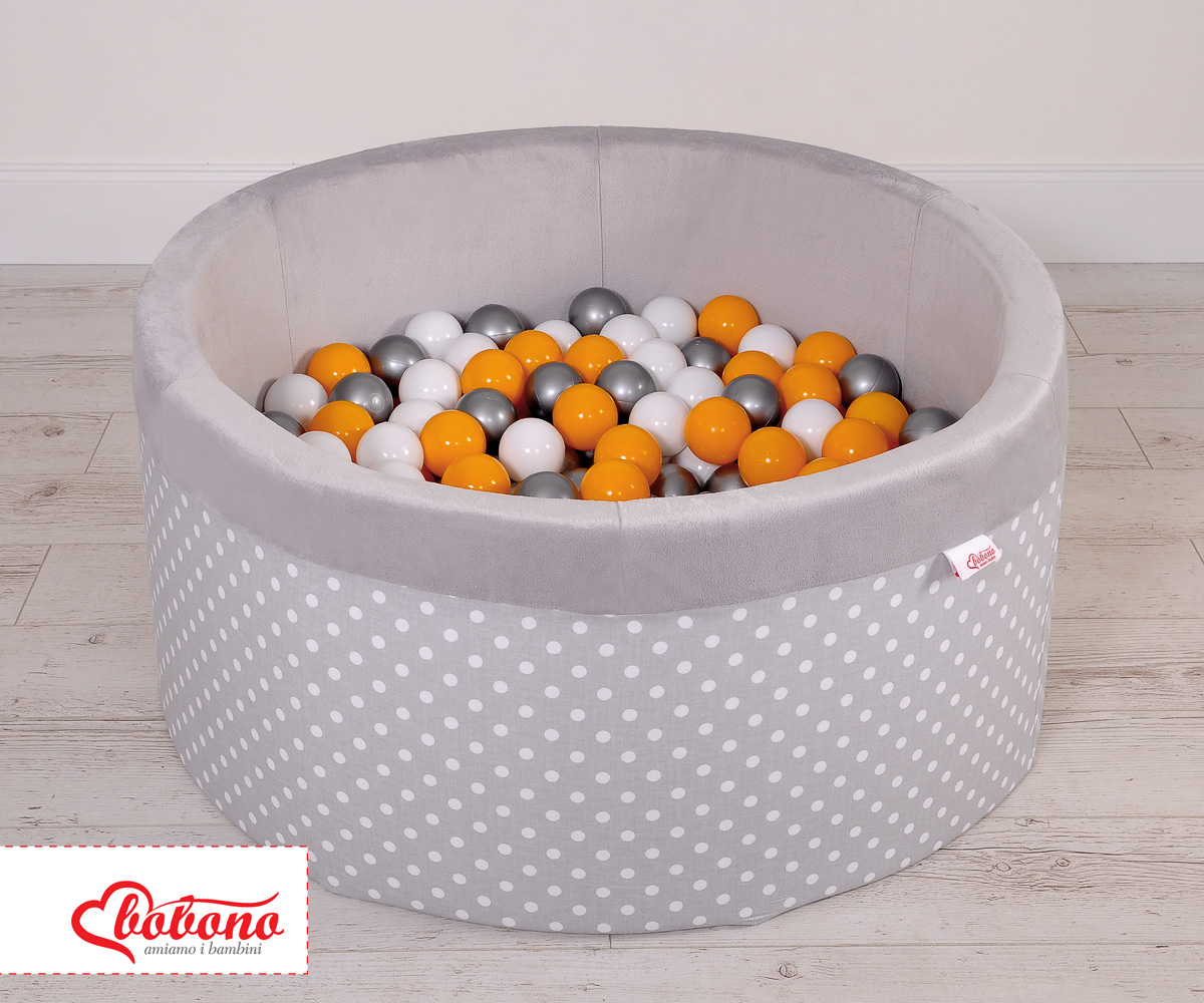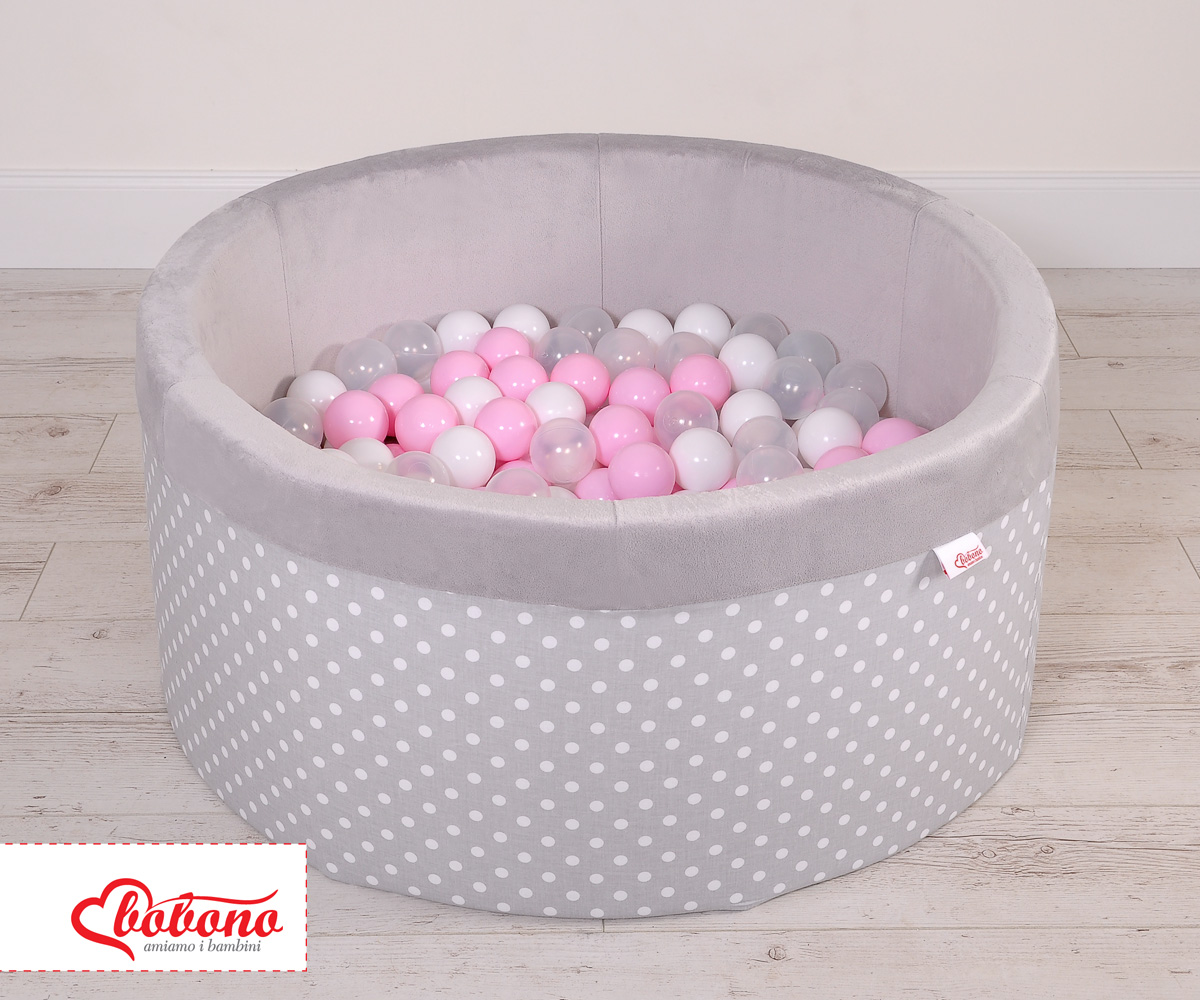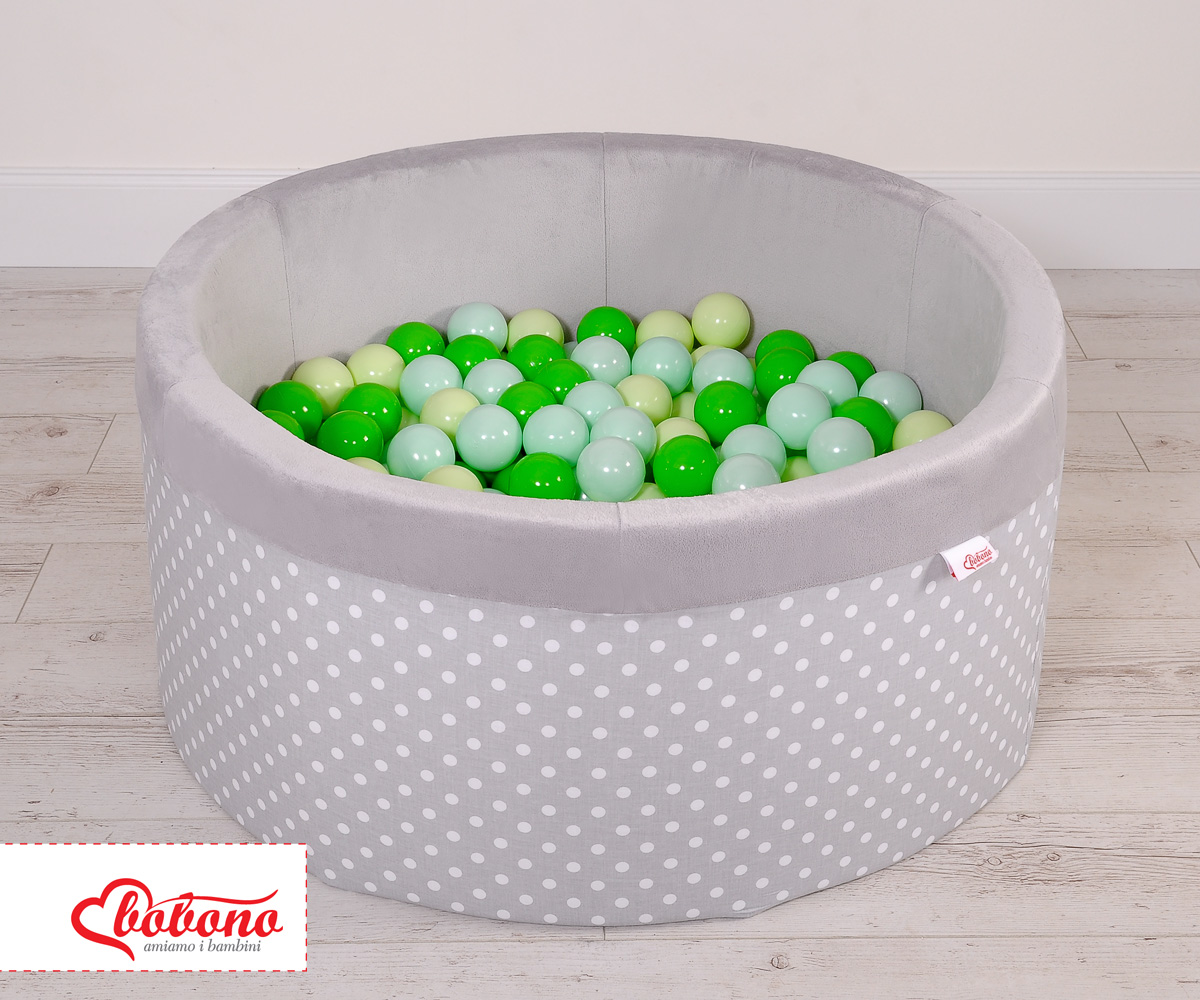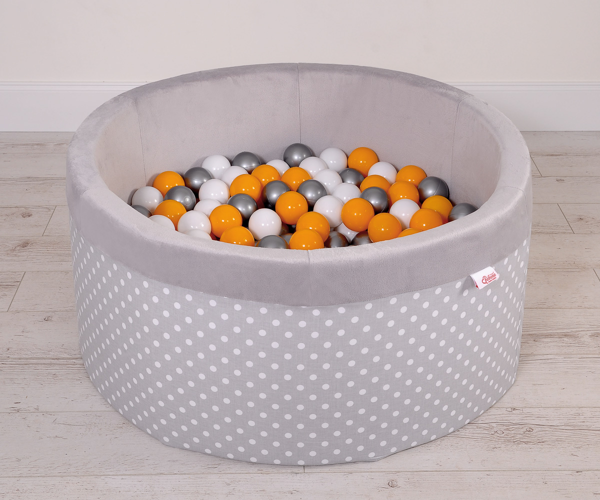 Toddlers Ball-pit minky with balls 200pcs - white dots on Gray Ball pit with colorful balls. It is suitable for playing both at home and in the open air. It is ideal not only for fun but it provides comfort, stimulation and helps develop hand eye coordination and it is positive for the child's development.