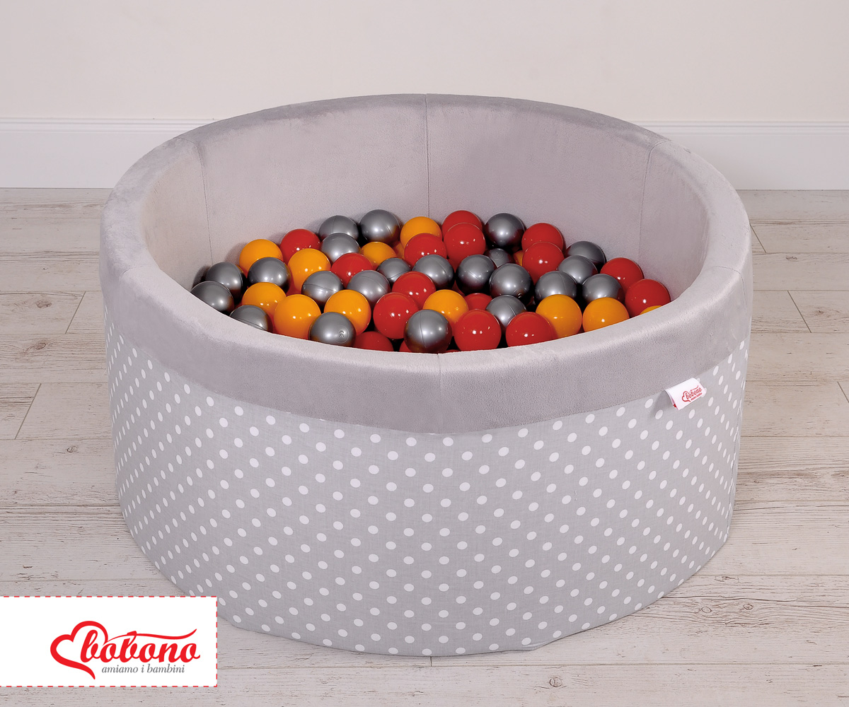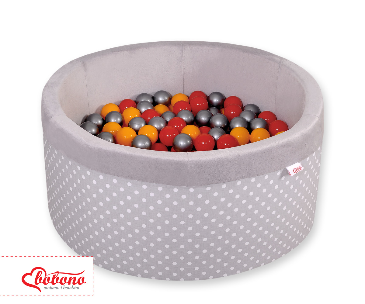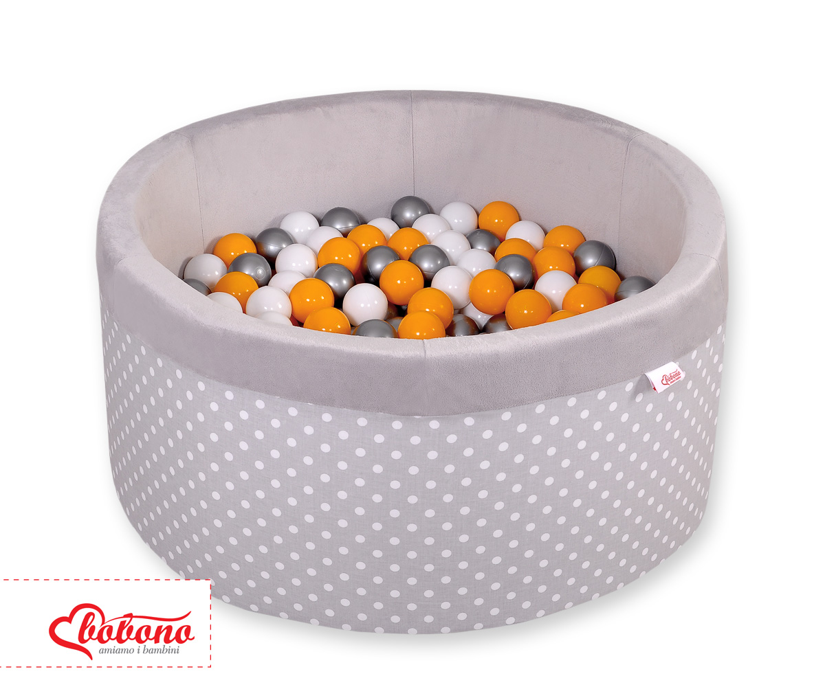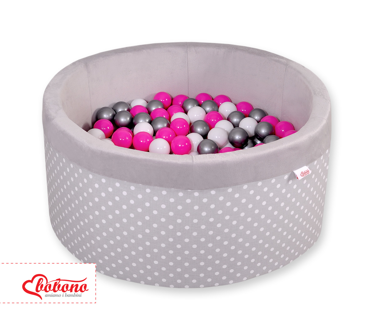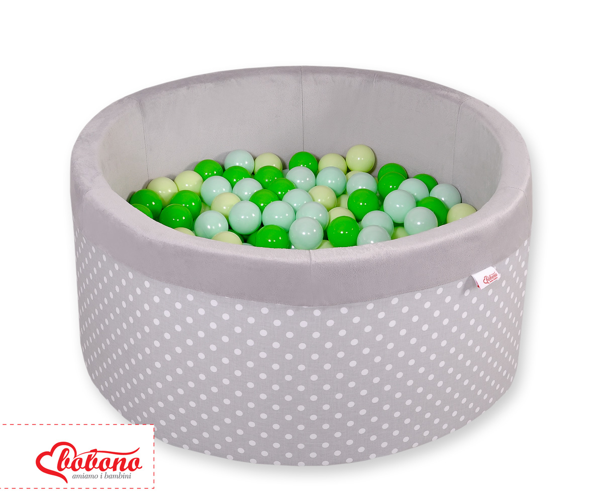 Toddlers Ball-pit minky with balls 200pcs - white dots on Gray Ball pit with colorful balls. It is suitable for playing both at home and in the open air. It is ideal not only for fun but it provides comfort, stimulation and helps develop hand eye coordination and it is positive for the child's development.