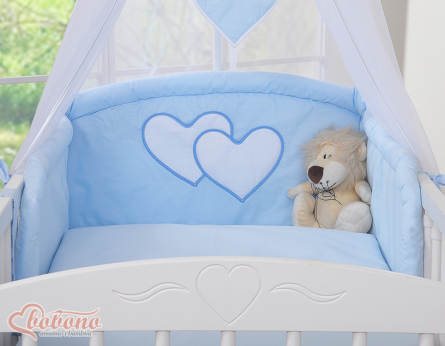 Dimensions: length 188 cm, height 35 cm. Specially designed with additional stitching. Perfectly fit for both size of cots: 60x120cm and 70x140cm. High headboard slightly rounded with decorative hearts, beautifully trimmed with satin piping. Specially trimmed, reinforced and thickened upper edge for greater softness and greater security in the cot.