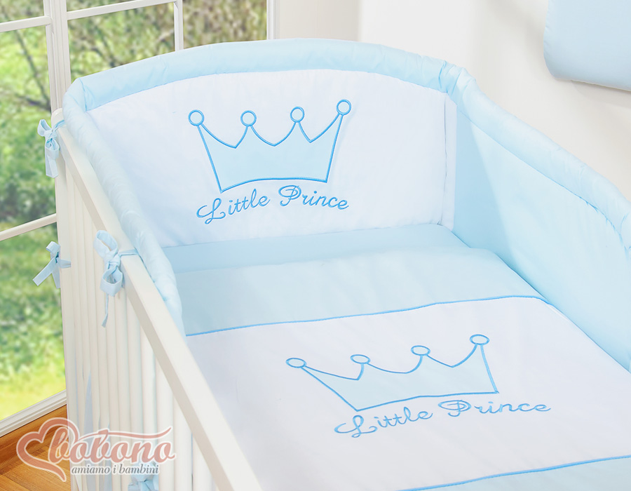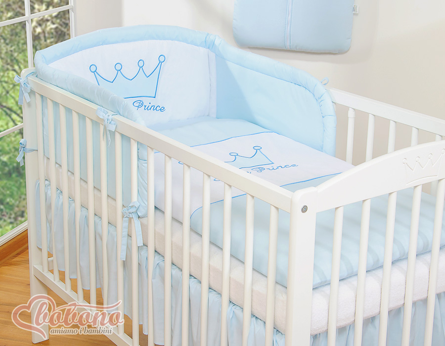 Dimensions: length 188 cm, height 35 cm. Specially designed with additional stitching. Perfectly fit for both size of cots: 60x120cm and 70x140cm. High headboard slightly rounded with decorative embroidery with crown. Specially trimmed, reinforced and thickened upper edge for greater softness and greater security in the cot. Bumper is filled with a special non-allergic and breathable Filling (certified OKOTEX).