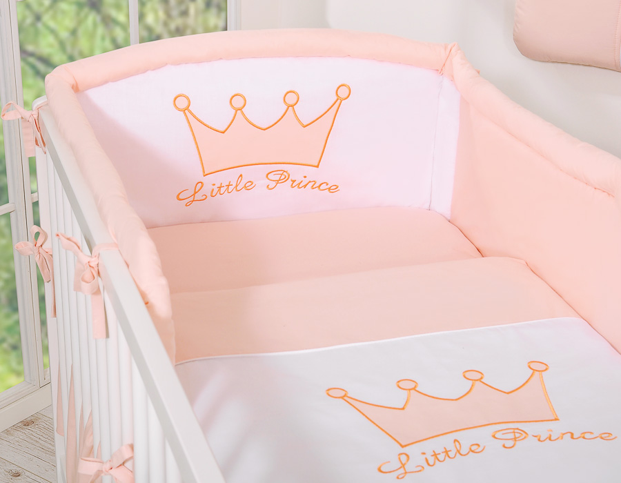 Dimensions: length 188 cm, height 35 cm. Specially designed with additional stitching. Perfectly fit for both size of cots: 60x120cm and 70x140cm. High headboard slightly rounded with decorative embroidery with crown. Specially trimmed, reinforced and thickened upper edge for greater softness and greater security in the cot. Bumper is filled with a special non-allergic and breathable Filling (certified OKOTEX).