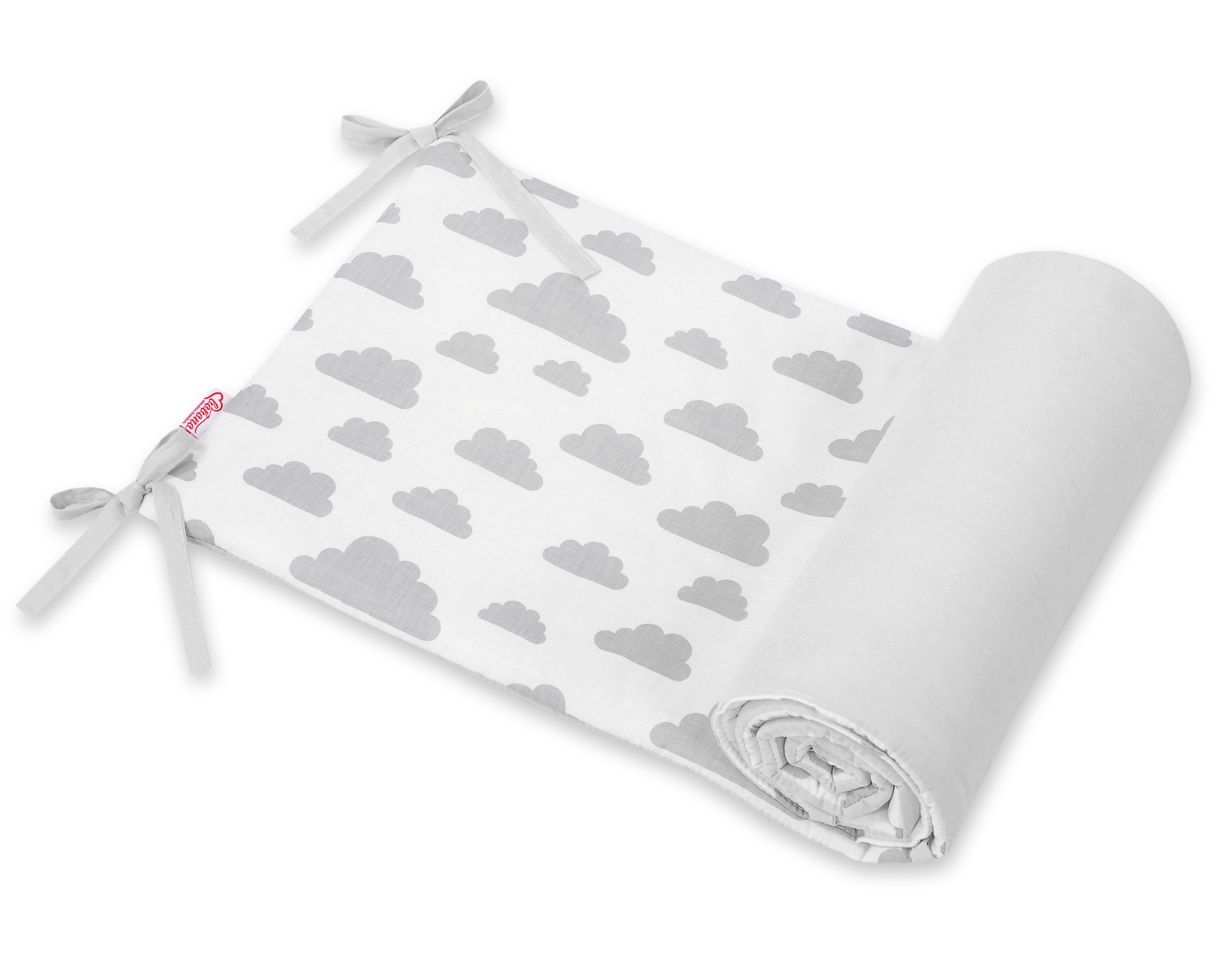 Specially constructed and with additional stitching, so that it perfectly fits both the 120x60 cm cot and the larger 140x70 cm baby cot. The bumper is filled with a layer of elastic anti-allergic silicone nonwoven fabric, thanks to which it fits nicely on the bed. The nonwoven fabric is Ökotex certified. The cover of the bumper is made of the highest quality cotton, which does not lose its properties even after many washes. Cotton strong straps allow for easy and solid attachment of the bumper.