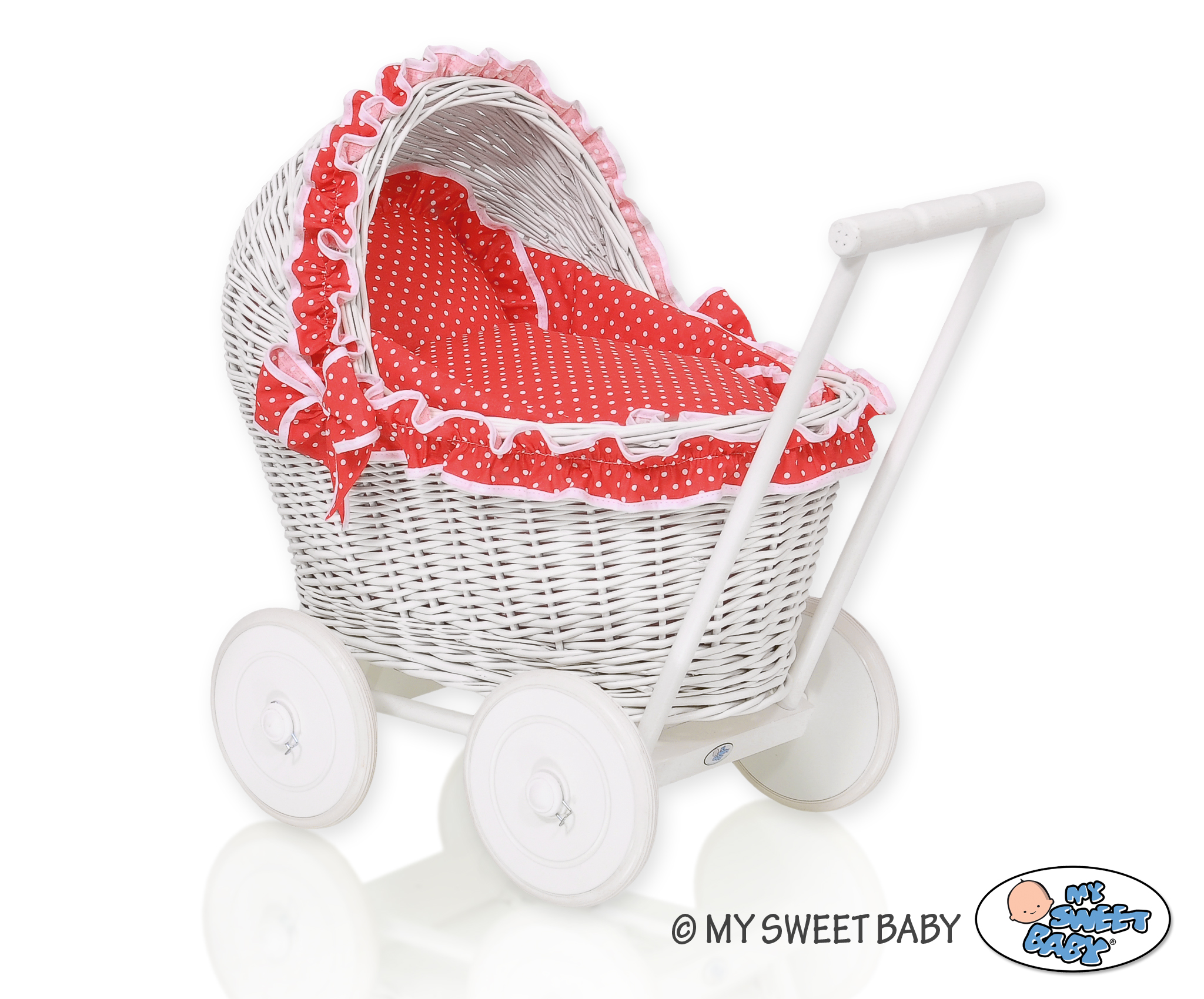 Dots White With Red Handmade Basket Style Retro Stroller Bassinet Doll Wicker White