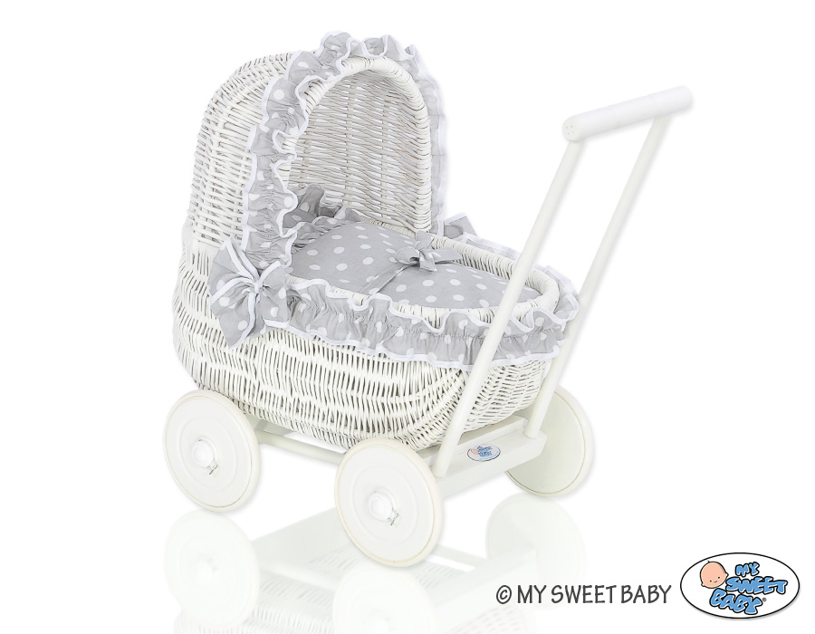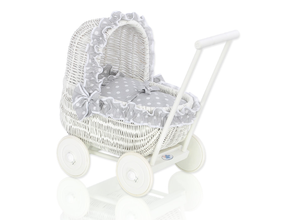 Baby Shop » Baby Toys » Doll prams » Wicker Doll prams » White Wicker Dolls Prams » White Wicker Doll Pram Basket Bedding Set White Dots on Gray