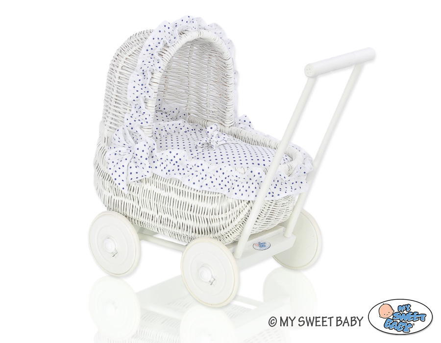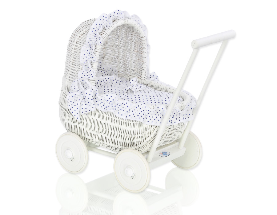 White Wicker Doll Pram Basket Bedding Set White with Navy Blue DotsWhite Wicker Doll Pram Basket Bedding Set White with Navy Blue DotsWhite Wicker Doll Pram Basket Bedding Set White with Navy Blue Dots