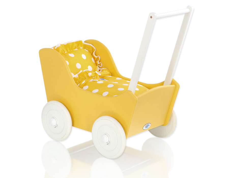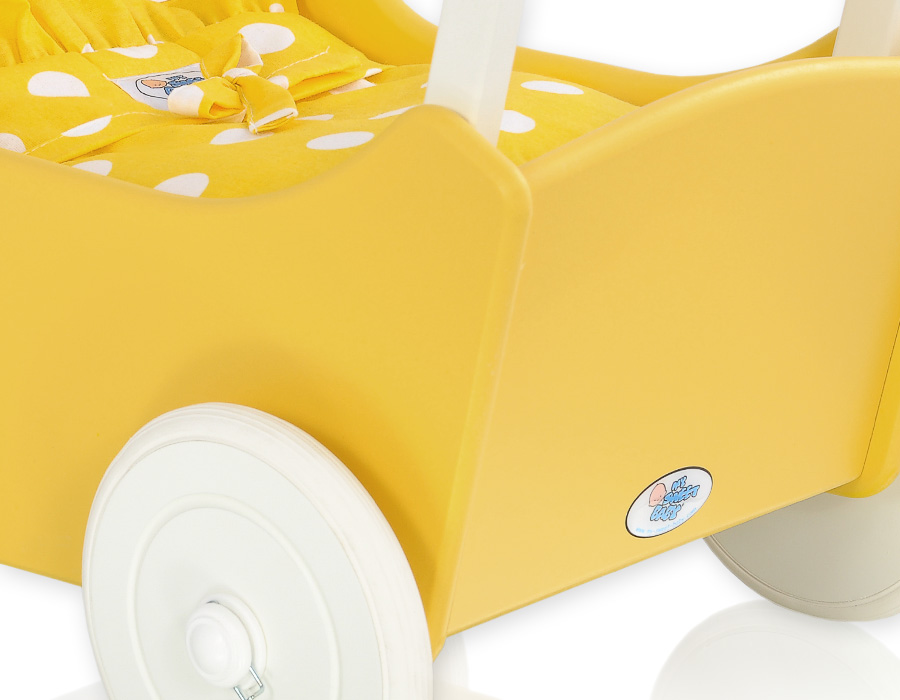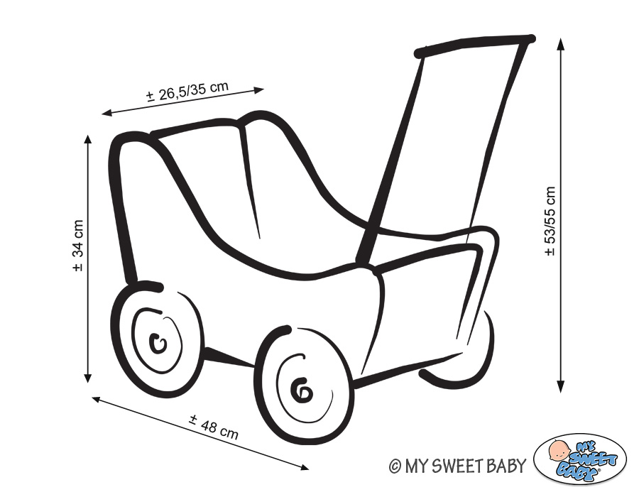 The wheels have non-slip tires that do not scratch the floor. The doll pram has an adjustable wooden handle. It can be mounted on two heights (53cm or 55cm measured from the floor).