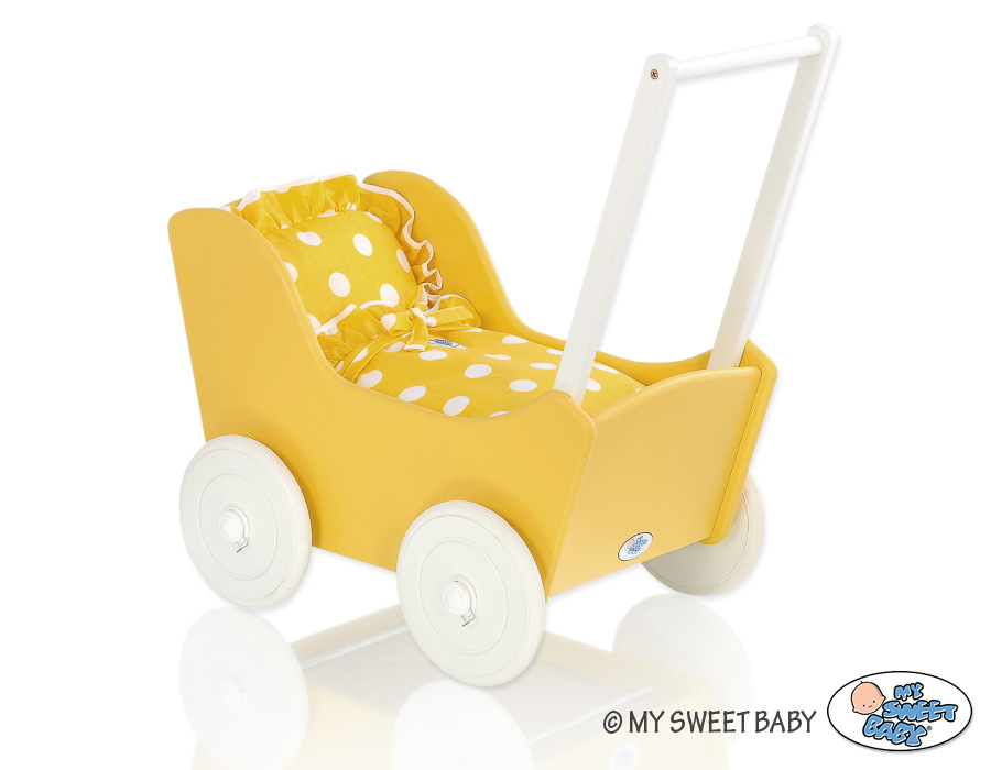 Great gift for a little girl. The doll pram is the top product for children. Made of safe materials. Painted with ecological paints. Wheels are mounted on metal axles, with a click-clack mechanism, which makes them easier to turn and do not fall.