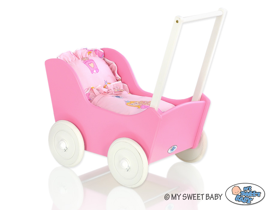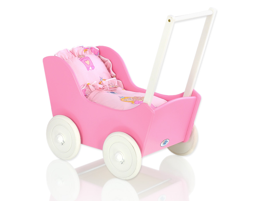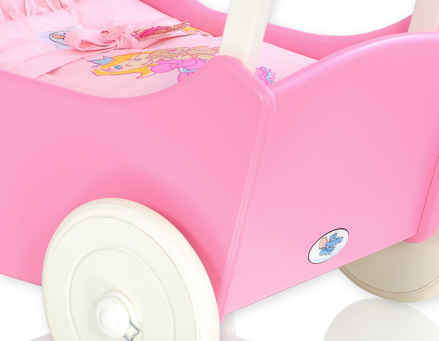 Great gift for a little girl. The doll pram is the top product for children. Made of safe materials. Painted with ecological paints. Wheels are mounted on metal axles, with a click-clack mechanism, which makes them easier to turn and do not fall.
