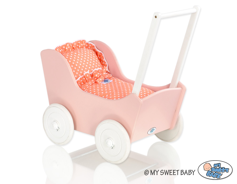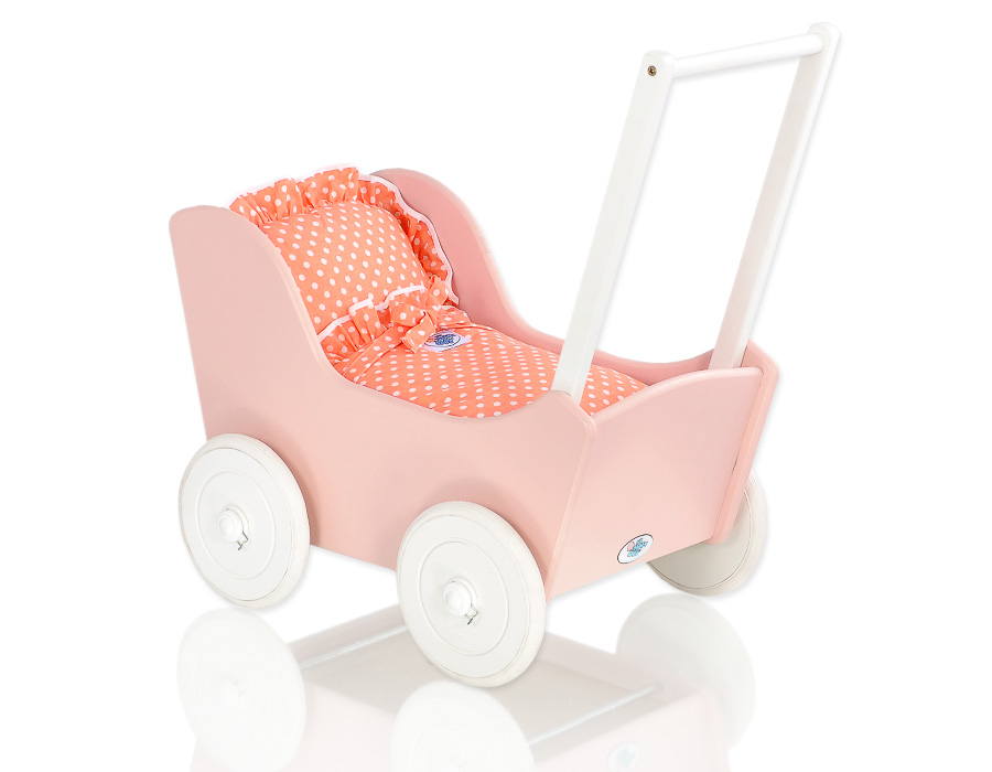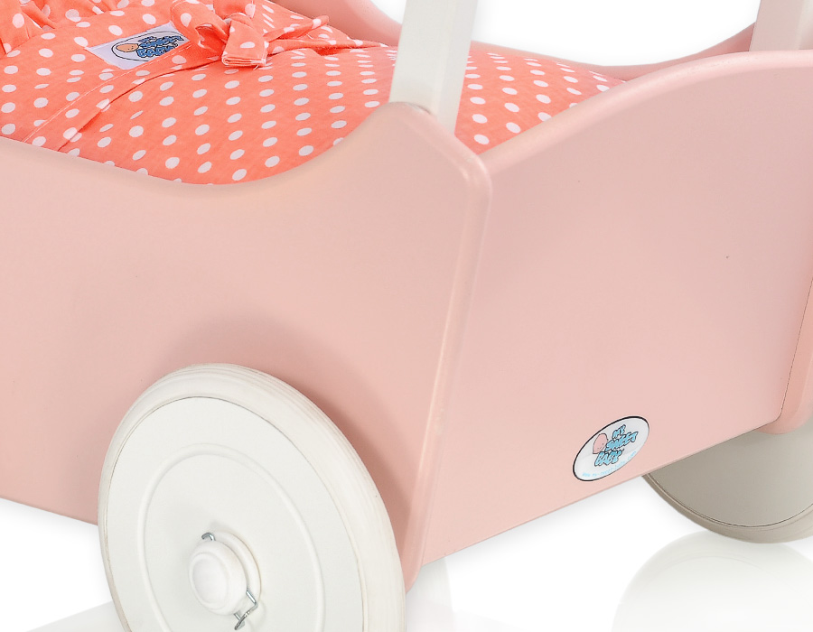 The wheels have non-slip tires that do not scratch the floor. The doll pram has an adjustable wooden handle. It can be mounted on two heights (53cm or 55cm measured from the floor).