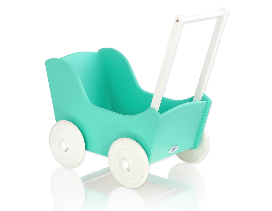 The wheels have non-slip tires that do not scratch the floor. The doll pram has an adjustable wooden handle. It can be mounted on two heights (53cm or 55cm measured from the floor).