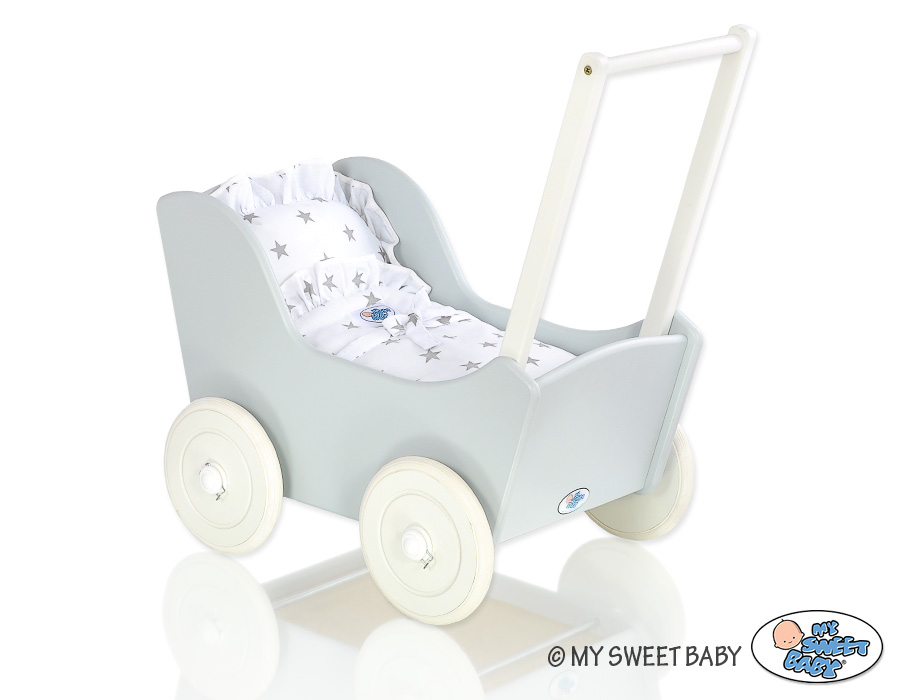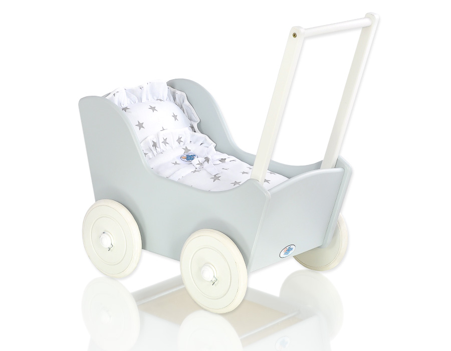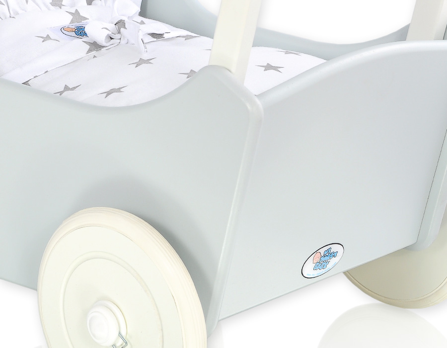 The wheels have non-slip tires that do not scratch the floor. The doll pram has an adjustable wooden handle. It can be mounted on two heights (53cm or 55cm measured from the floor).