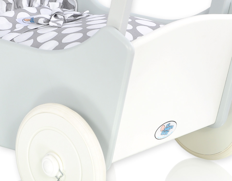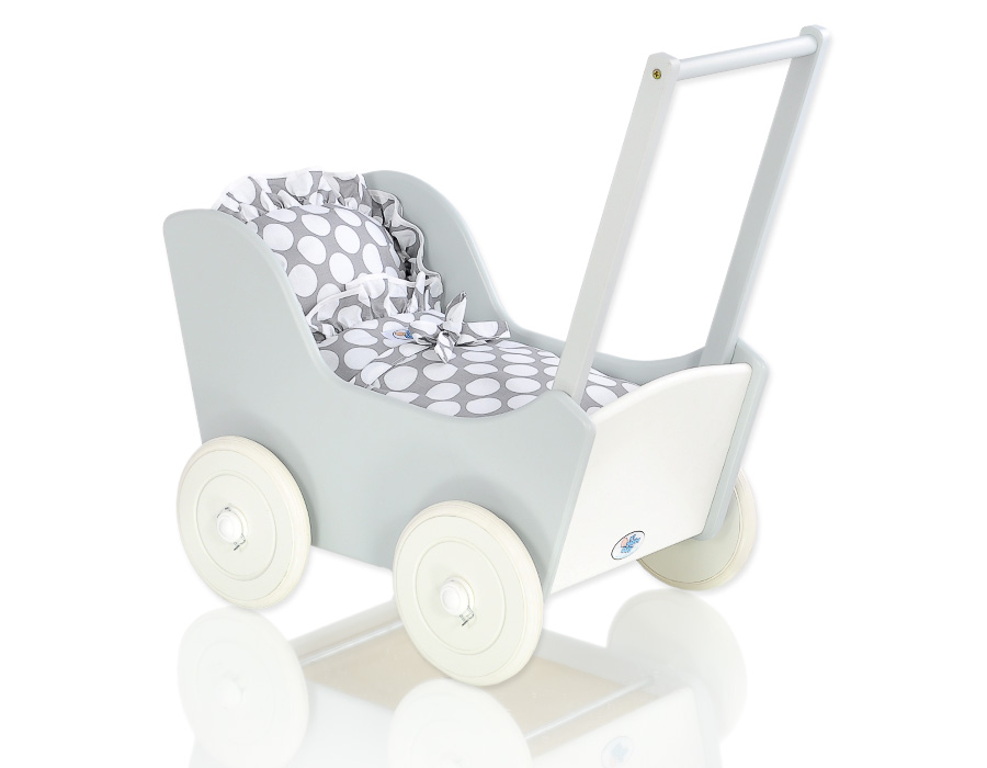 The wheels have non-slip tires that do not scratch the floor. The doll pram has an adjustable wooden handle. It can be mounted on two heights (53cm or 55cm measured from the floor).