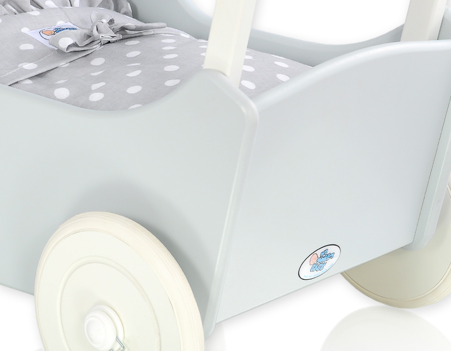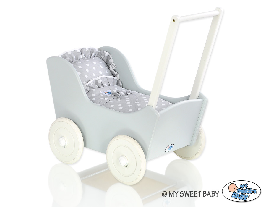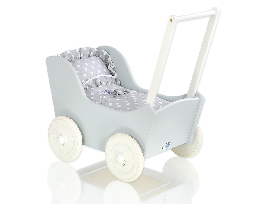Baby Shop » Baby Toys » Doll prams » Doll prams » Gray » Wooden Doll Pram Stroller GrayBedding Set White Dots on Gray