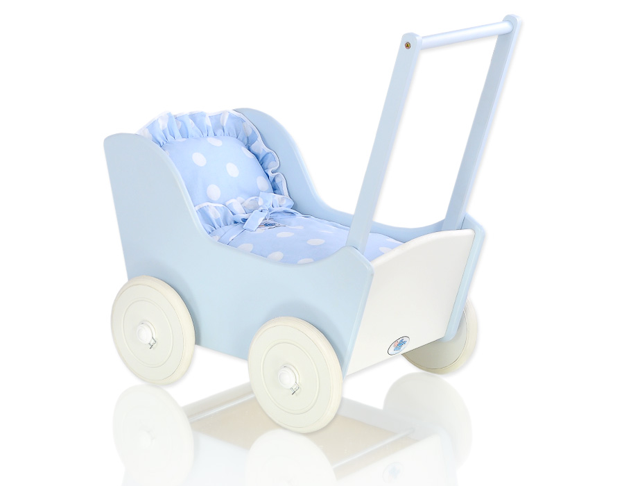 The wheels have non-slip tires that do not scratch the floor. The doll pram has an adjustable wooden handle. It can be mounted on two heights (53cm or 55cm measured from the floor).