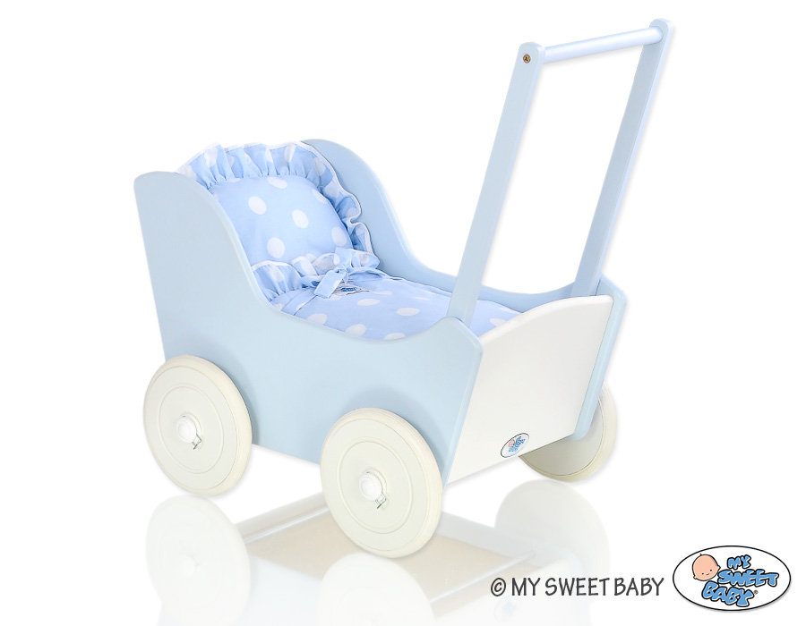 Great gift for a little girl. The doll pram is the top product for children. Made of safe materials. Painted with ecological paints. Wheels are mounted on metal axles, with a click-clack mechanism, which makes them easier to turn and do not fall.