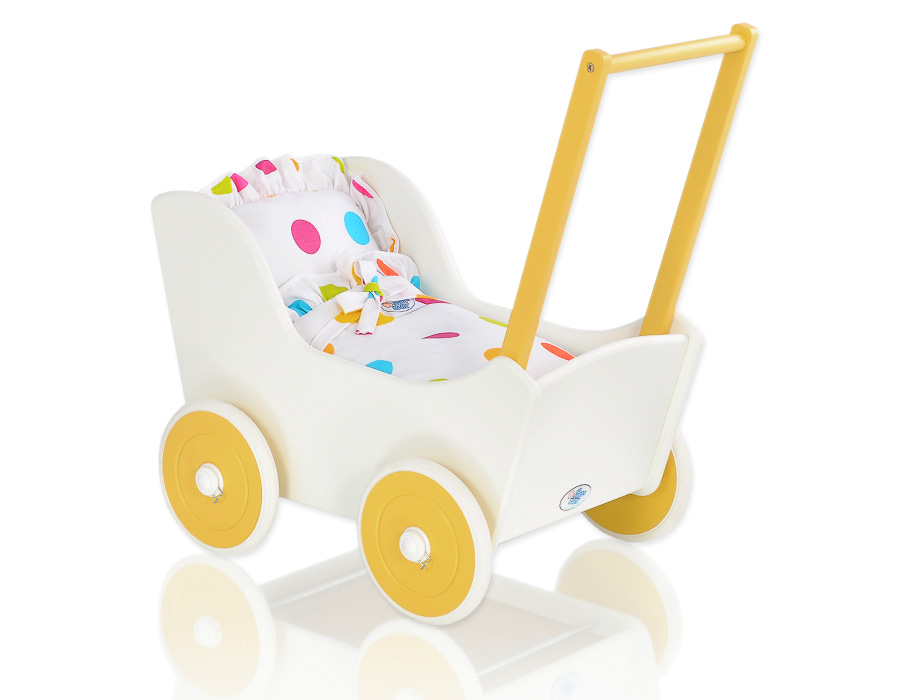 The wheels have non-slip tires that do not scratch the floor. The doll pram has an adjustable wooden handle. It can be mounted on two heights (53cm or 55cm measured from the floor).