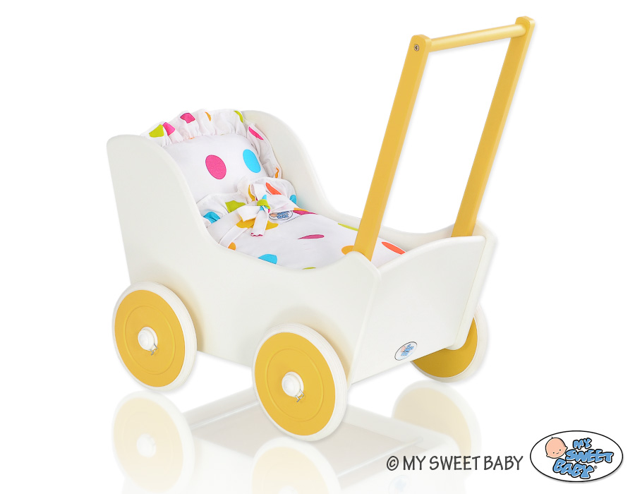 Great gift for a little girl. The doll pram is the top product for children. Made of safe materials. Painted with ecological paints. Wheels are mounted on metal axles, with a click-clack mechanism, which makes them easier to turn and do not fall.