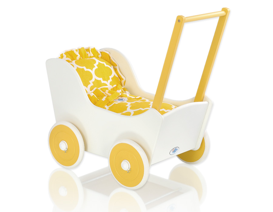 The wheels have non-slip tires that do not scratch the floor. The doll pram has an adjustable wooden handle. It can be mounted on two heights (53cm or 55cm measured from the floor).