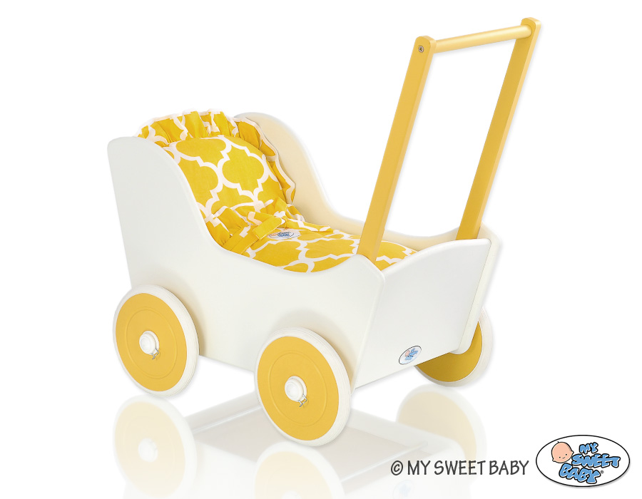 Great gift for a little girl. The doll pram is the top product for children. Made of safe materials. Painted with ecological paints. Wheels are mounted on metal axles, with a click-clack mechanism, which makes them easier to turn and do not fall.