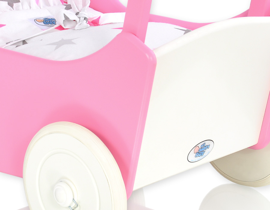 The wheels have non-slip tires that do not scratch the floor. The doll pram has an adjustable wooden handle. It can be mounted on two heights (53cm or 55cm measured from the floor).