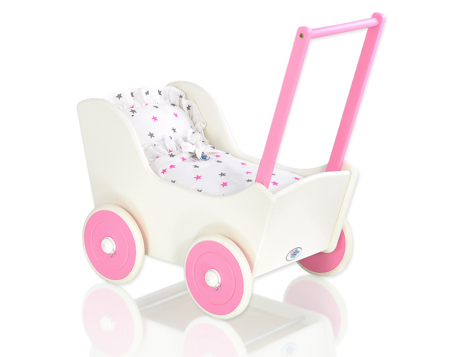 The wheels have non-slip tires that do not scratch the floor. The doll pram has an adjustable wooden handle. It can be mounted on two heights (53cm or 55cm measured from the floor).