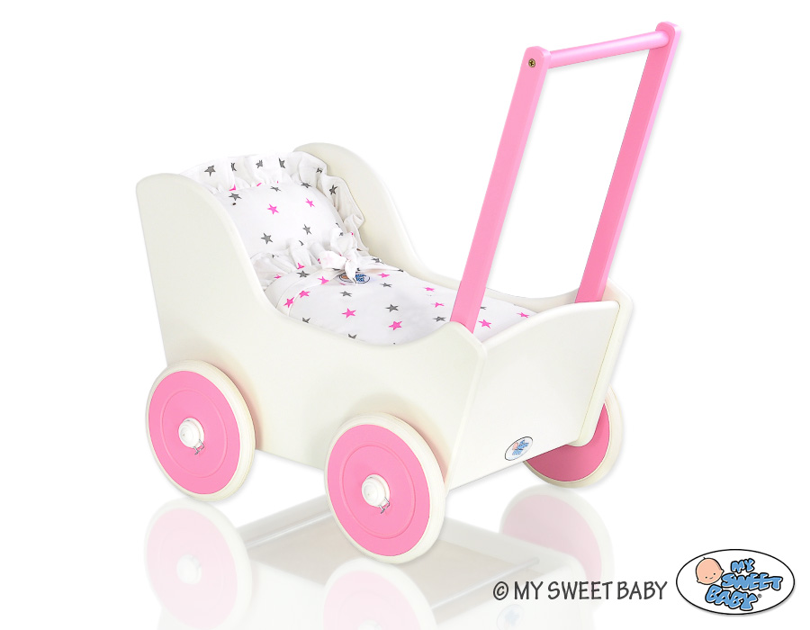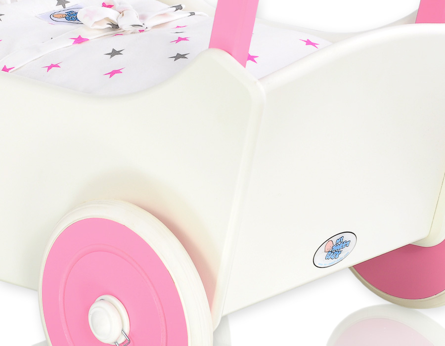 Great gift for a little girl. The doll pram is the top product for children. Made of safe materials. Painted with ecological paints. Wheels are mounted on metal axles, with a click-clack mechanism, which makes them easier to turn and do not fall.