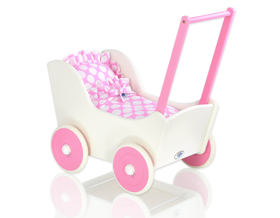 Great gift for a little girl. The doll pram is the top product for children. Made of safe materials. Painted with ecological paints. Wheels are mounted on metal axles, with a click-clack mechanism, which makes them easier to turn and do not fall.