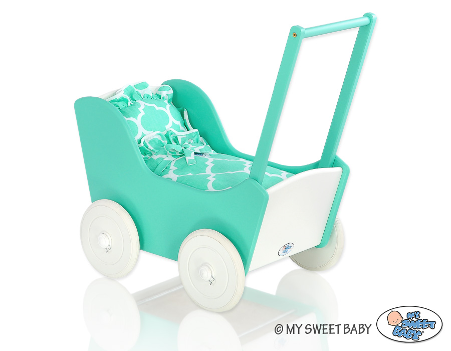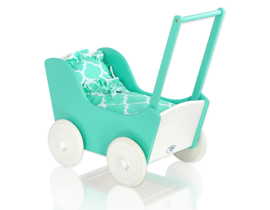 Great gift for a little girl. The doll pram is the top product for children. Made of safe materials. Painted with ecological paints. Wheels are mounted on metal axles, with a click-clack mechanism, which makes them easier to turn and do not fall.